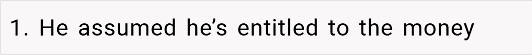 If one partner assumes entitlement without mutual agreement, it can create deep-seated resentments.” ([​kidshealth.org]) In this situation, the OP’s outburst reflects her deeply held belief that the money left by her nanna is a personal legacy meant for her, not a joint marital asset. Dr. Durvasula further explains that,