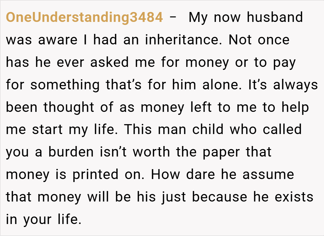 When one partner feels that their personal legacy is being devalued or appropriated without consent, it’s a signal that boundaries have been crossed.” Her perspective underscores that the OP’s assertion—while it might seem harsh to some—is an attempt to reclaim control over her own financial future and maintain her sense of identity.