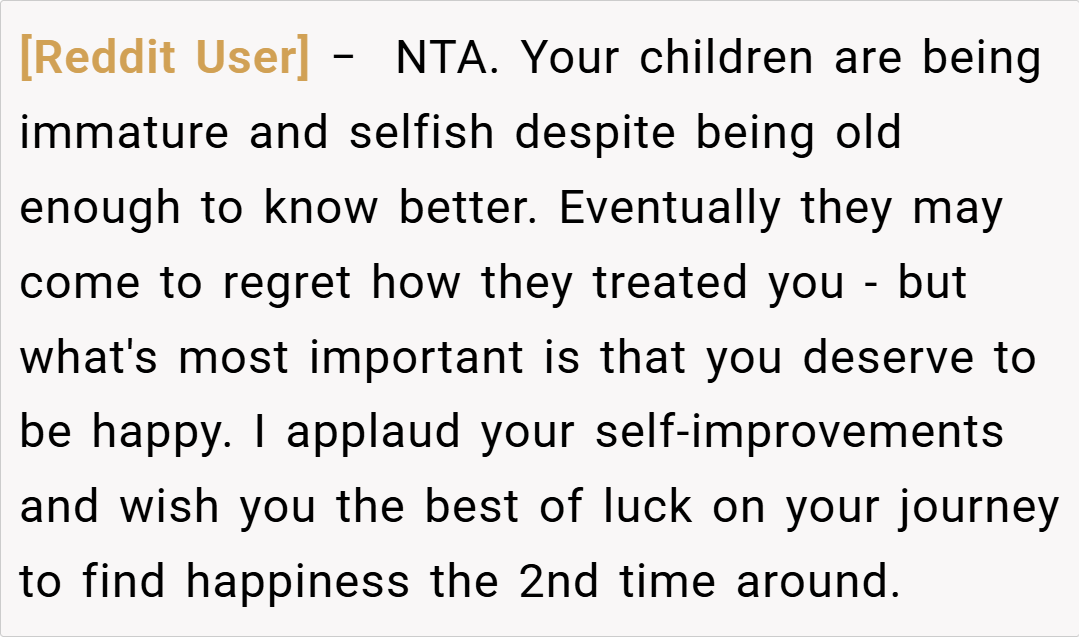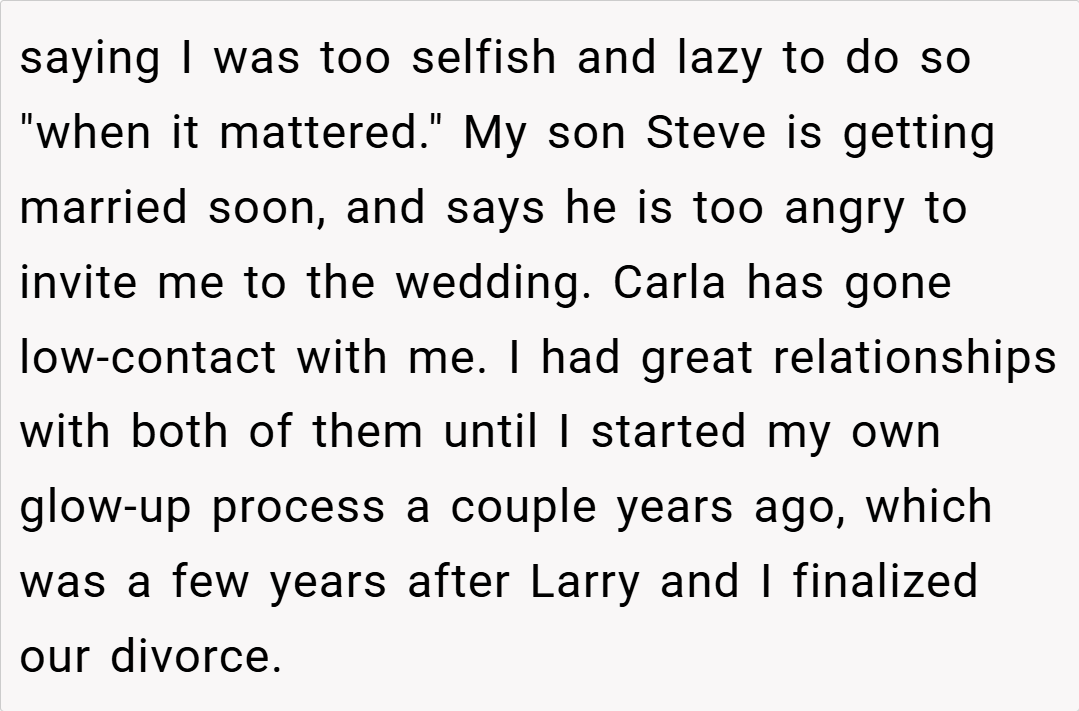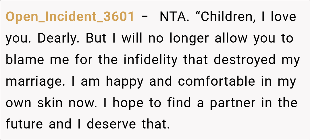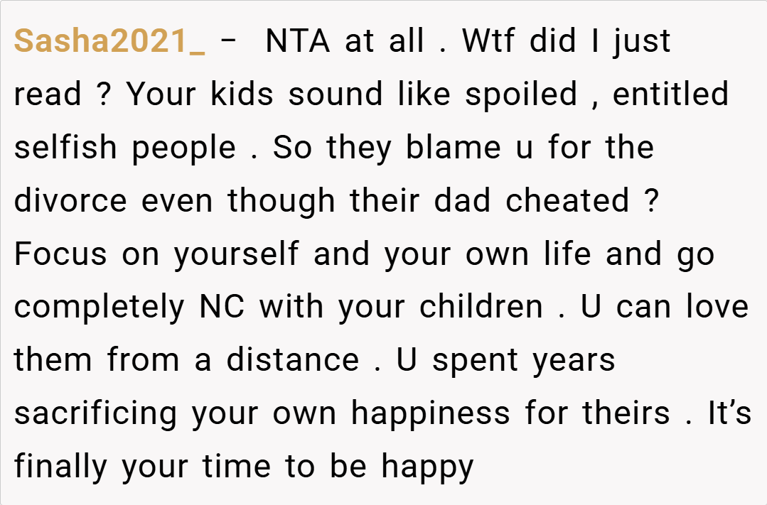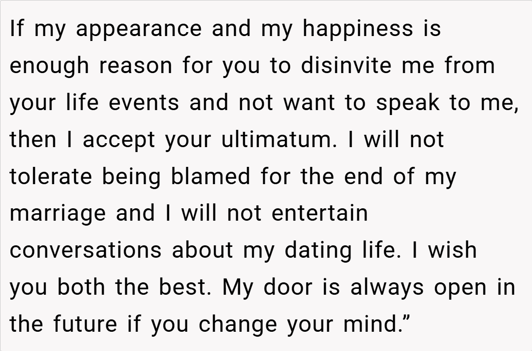 The online community is divided on this issue. In one comment, several users praised the writer for finally prioritizing her well-being, stating that self-love shouldn’t be contingent on another’s approval. One user commented, “You deserve to be happy and feel good about yourself, regardless of what anyone expected of you back then.”