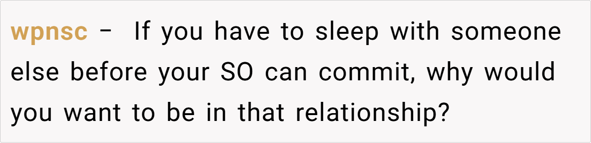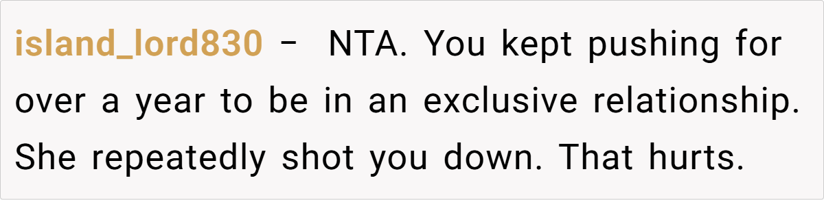 The consensus seems to be that the real issue isn’t the hookup itself but the ongoing lack of clarity and commitment in their relationship. Comments ranged from supportive “You deserve to be with someone who’s all in” to more critical voices suggesting that he should have addressed the issues directly without testing her resolve in such a hurtful way.