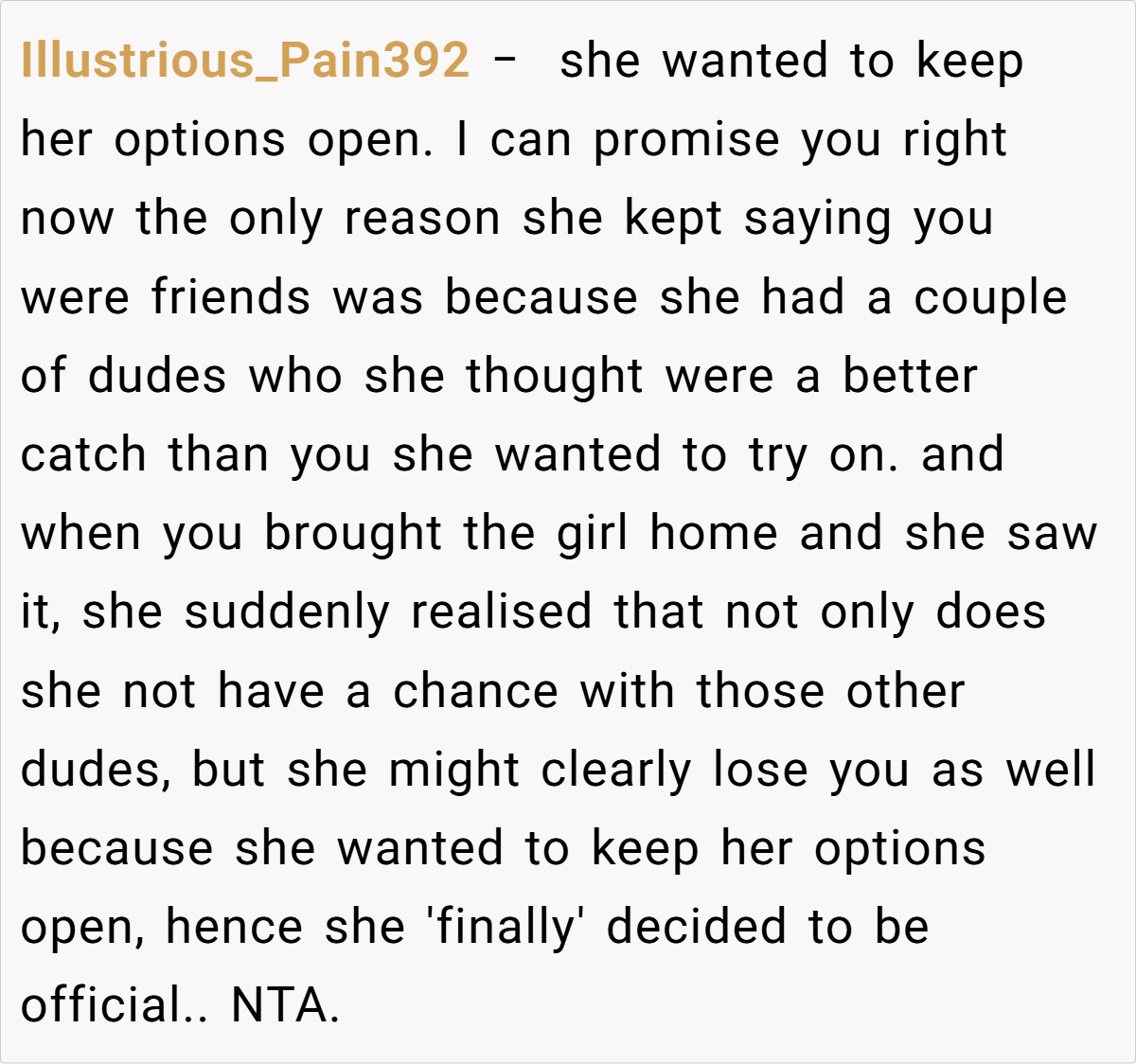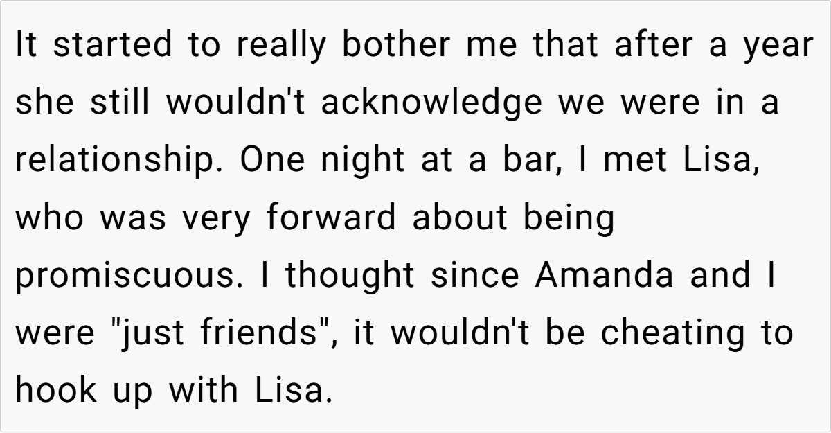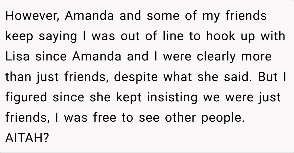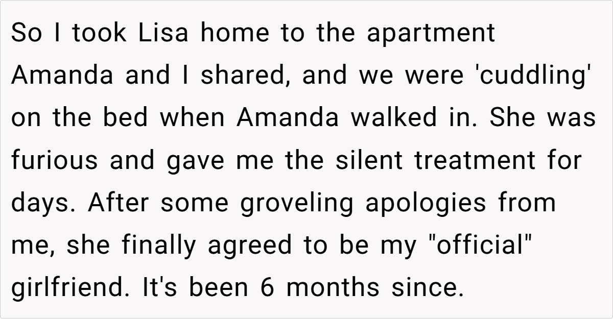 After days of silent treatment and groveling on his part, Amanda finally agreed to be his “official” girlfriend. But even six months later, the repercussions of that moment still echo. Does his decision to hook up with Lisa make him the asshole, or was it a justified reaction to an ambiguous, unbalanced arrangement?