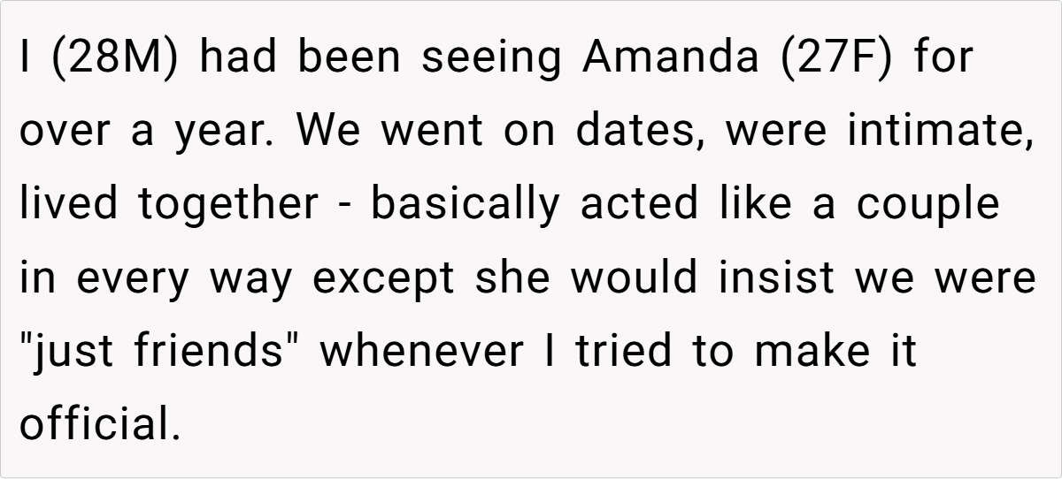In modern relationships, the line between being “just friends” and being in an exclusive partnership can sometimes blur into a confusing gray area. In this story, a 28-year-old man had been seeing Amanda for over a year.