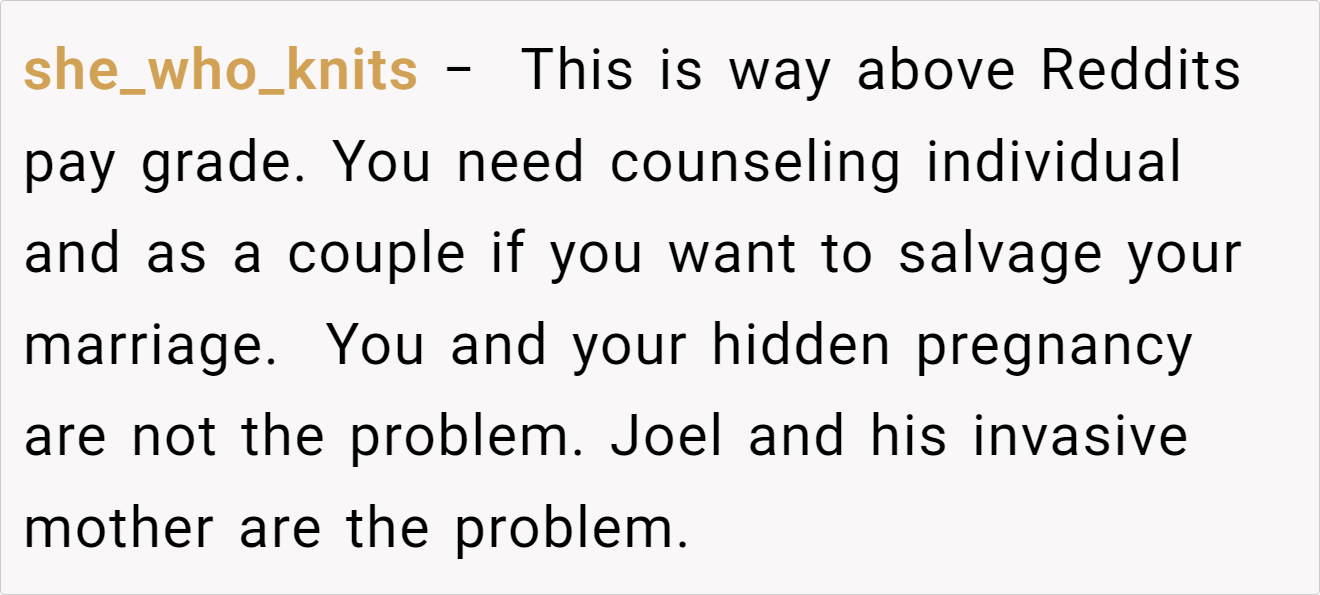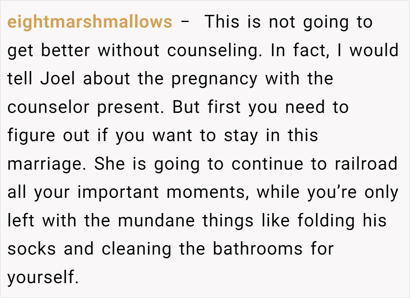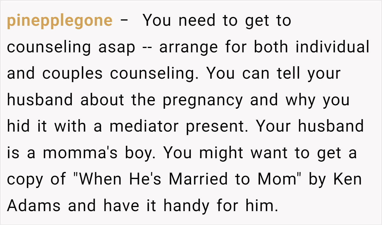 Without this step, patterns will likely repeat. For the woman in this story, finding her voice is crucial—not only for her emotional well-being but also for the long-term health of her marriage. While telling her husband about the pregnancy is inevitable, doing so in a supportive, structured environment can help her feel less alone.