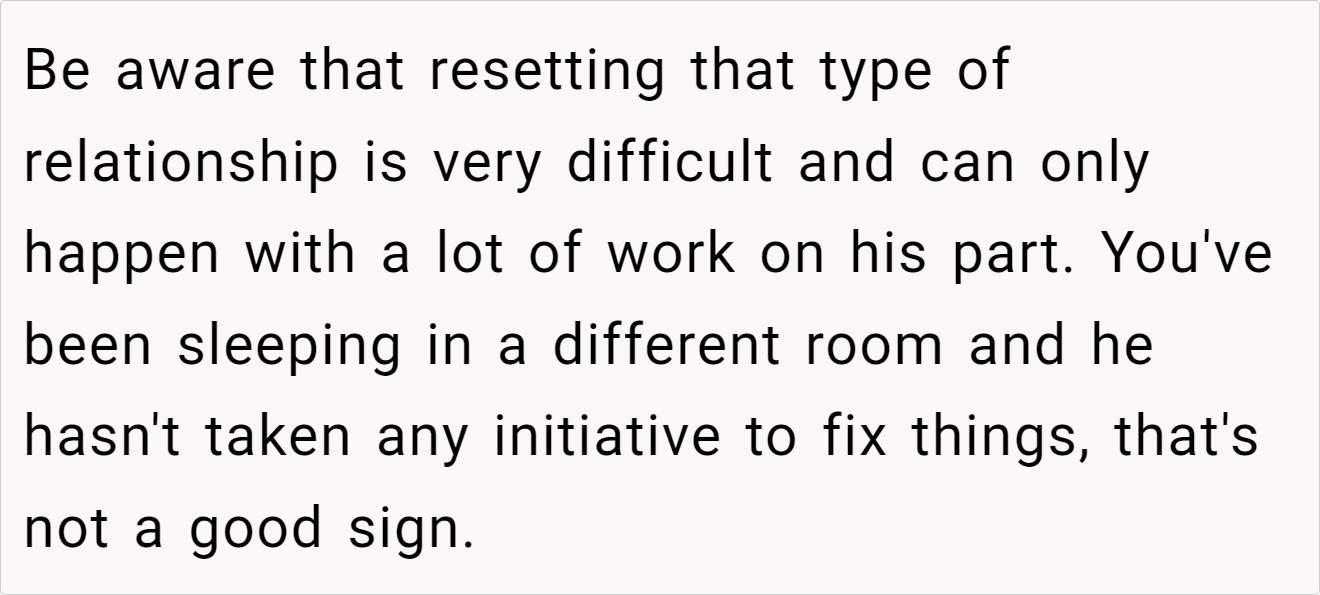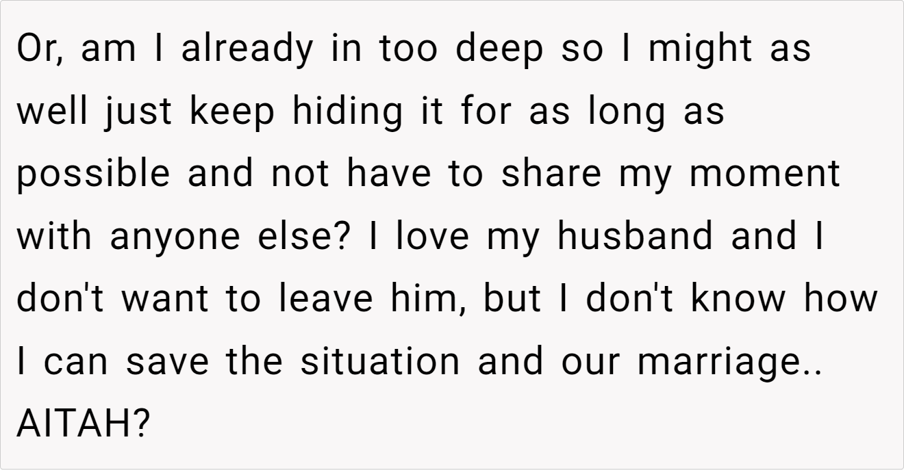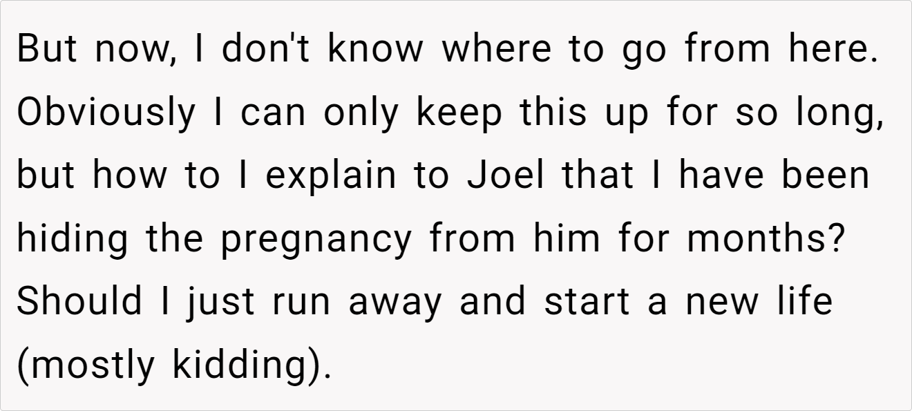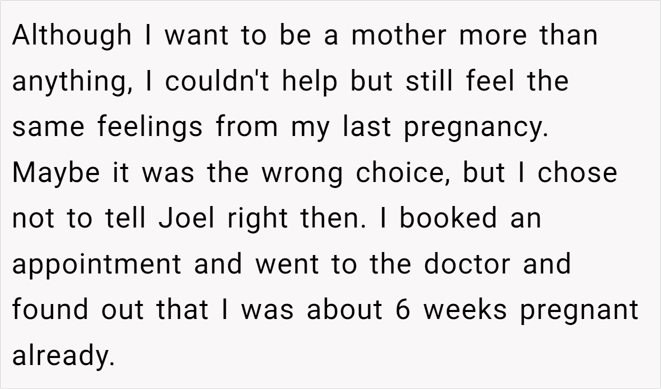 Without this step, patterns will likely repeat. For the woman in this story, finding her voice is crucial—not only for her emotional well-being but also for the long-term health of her marriage. While telling her husband about the pregnancy is inevitable, doing so in a supportive, structured environment can help her feel less alone.