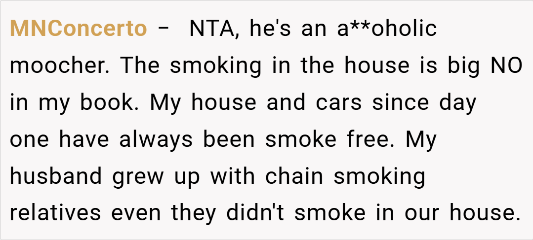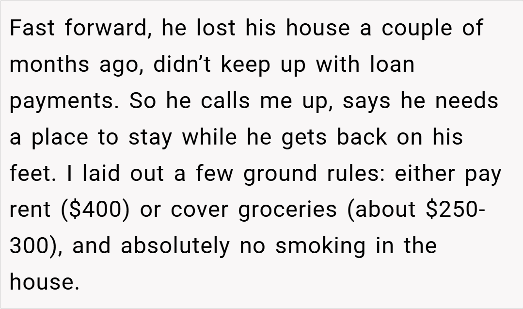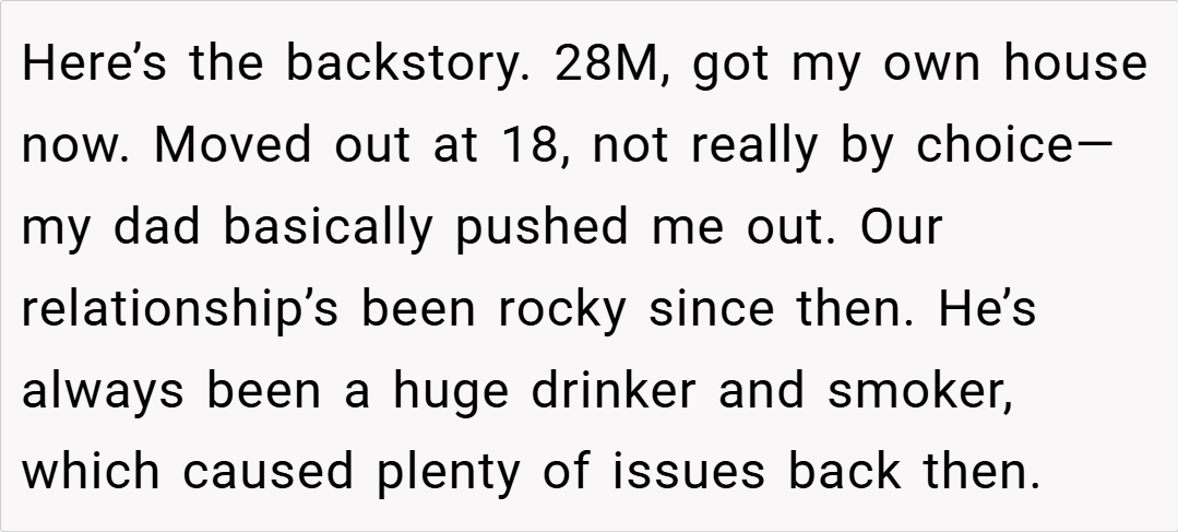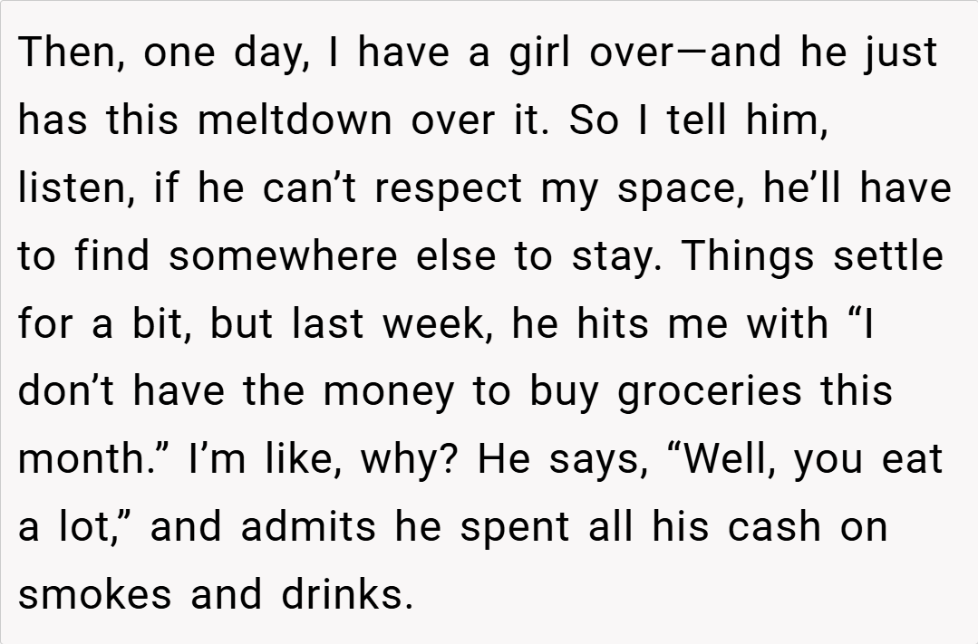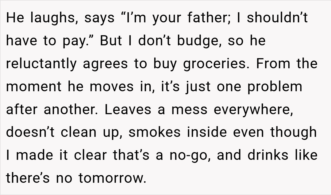 When his father, a heavy drinker and smoker, lost his own home and sought refuge with him, the initial agreement was simple: pay rent or cover groceries and follow strict no-smoking rules. However, his father’s repeated disregard—leaving a mess, smoking inside, and spending his cash on vices—eventually culminated in an incident where, after claiming he “couldn’t afford to buy groceries” (and blaming his son’s appetite for it), the son decided that enough was enough.