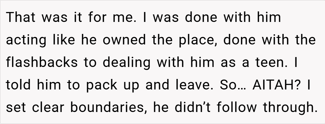 Furious at the constant boundary violations and reminders of past mistreatment, he told his father to pack up and leave. Now, he’s left wondering: Am I the asshole for enforcing my house rules by kicking my dad out?