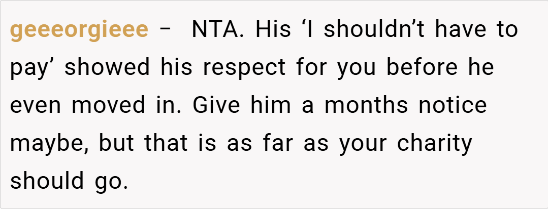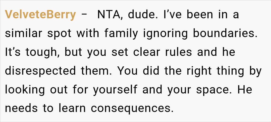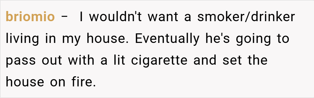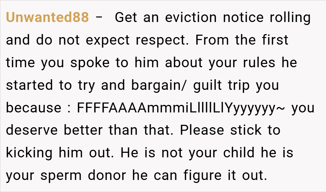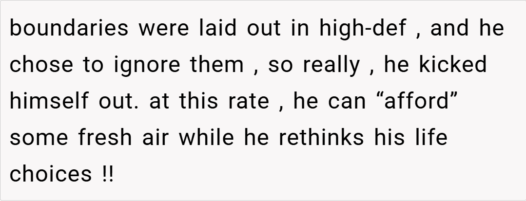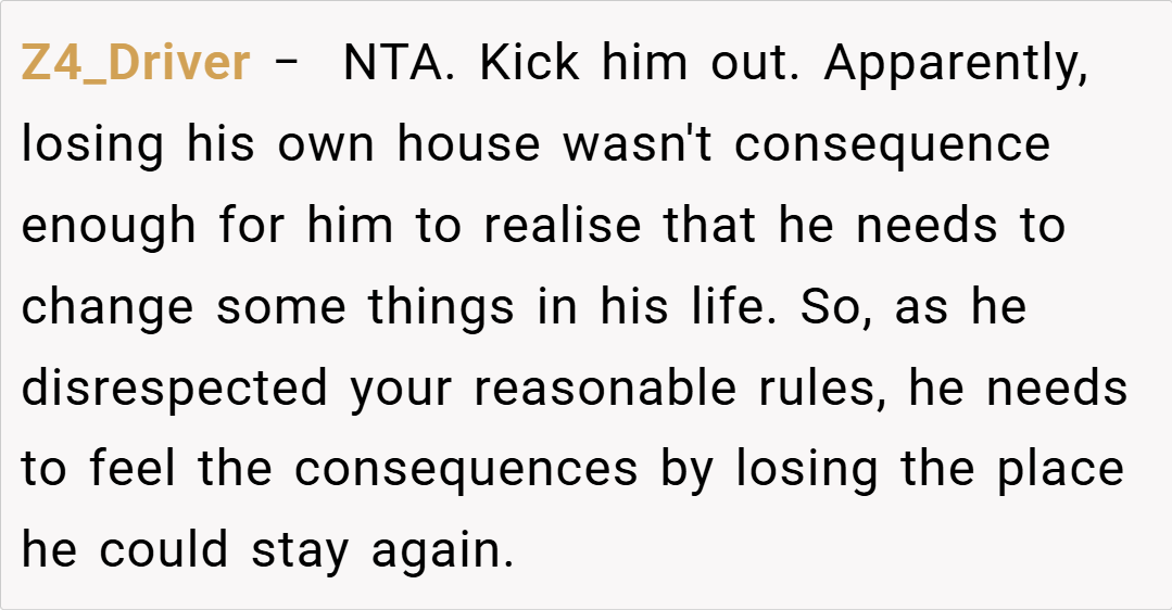 Another group shared similar experiences, commenting, “After being pushed out as a teenager and then dealing with the same issues later, I wouldn’t blame you at all for drawing the line. Your home is your sanctuary, not a dump for his habits.”