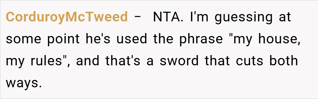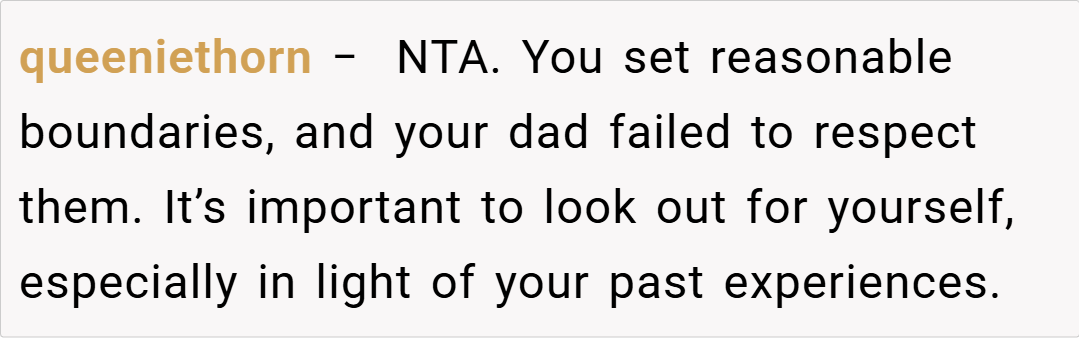 Several redditors expressed strong support, with one user stating, “You have every right to protect your space. If your dad isn’t willing to follow your house rules, you shouldn’t be forced to put up with his behavior. Boundaries are essential!”