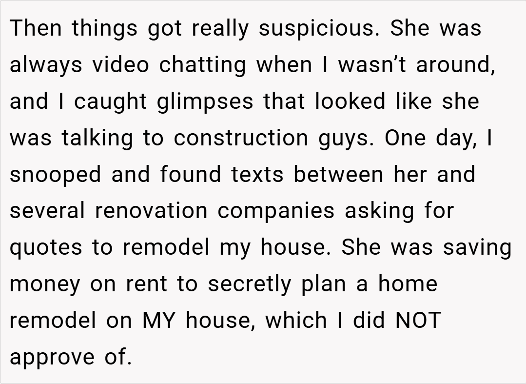Despite agreeing to a rent reduction to help her settle into a new job, her friend’s increasingly odd behavior raised suspicions. What started as small inconveniences eventually turned into covert plans to remodel the house without permission. In a situation where personal property and sentimental value are on the line, OP was forced to make a tough decision.