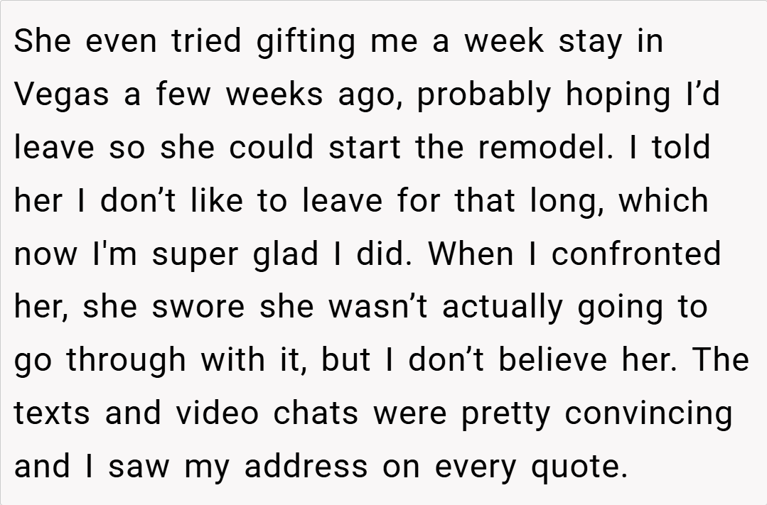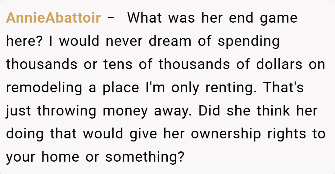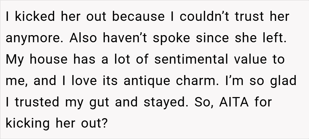 Ultimately, OP’s decision to kick out his friend after discovering her covert plans to remodel his house is a clear case of protecting one’s personal property and trust. While some may view the action as harsh, many agree that when trust is breached—especially involving financial and sentimental assets—it’s necessary to set strict boundaries.