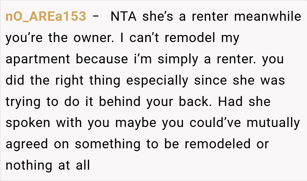 Many redditors empathize with OP, stating that if your friend is secretly planning to remodel your house without permission, you have every right to protect your property and trust. “It’s not just about money—it’s about your personal space and the memories attached to it,” one commenter noted.