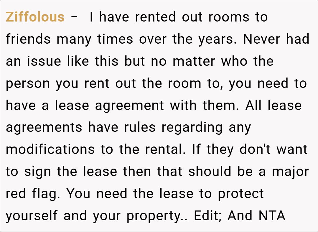 Family therapist Dr. Susan Johnson adds, “Renting out a room in your home is a significant decision that relies on mutual respect and clear boundaries. If a friend covertly uses that trust to plan unauthorized changes, it not only disrespects your property but also your emotional connection to it. While the decision to cut ties is drastic, it is justified when the underlying trust is irrevocably broken.”