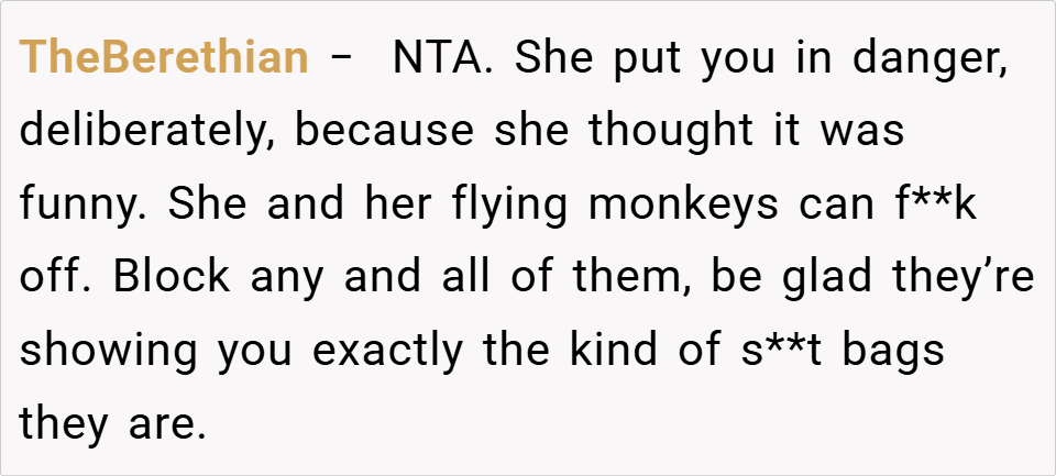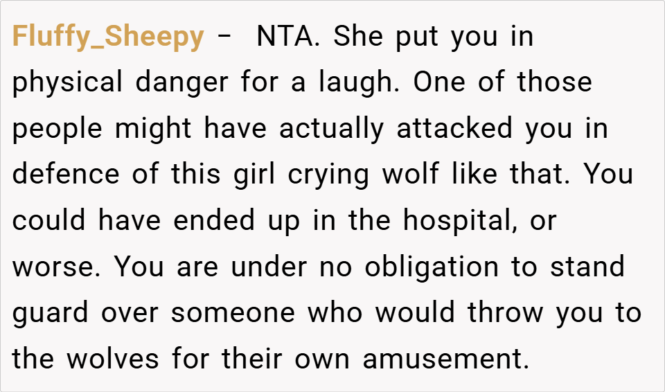 A review of top Reddit comments shows divided opinions. Many users sympathize with the narrator, arguing that Aya’s actions were dangerous and that he had every right to remove himself from the situation. Others believe that while the prank was unacceptable, he still should have ensured Aya’s safety before leaving. Some suggest that this incident highlights a broader issue of accountability when false claims are made in public settings.