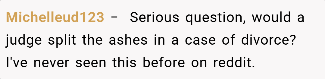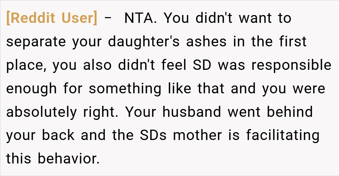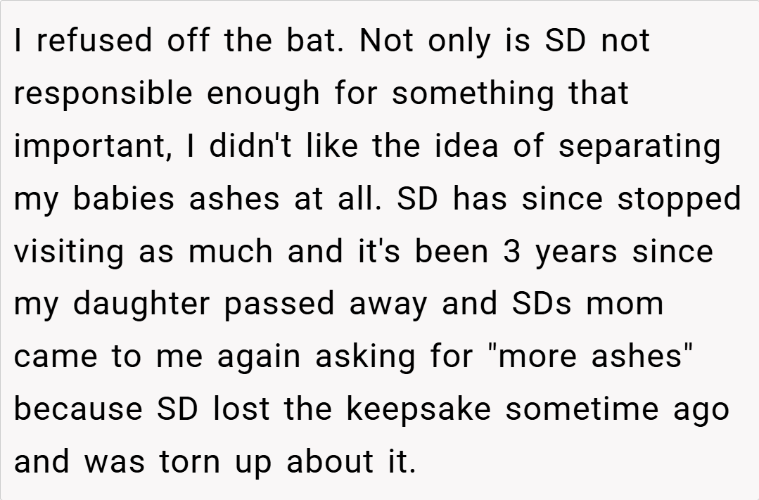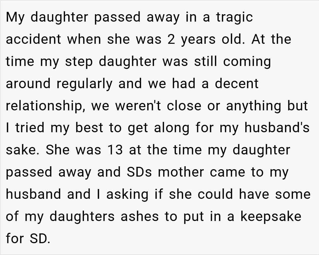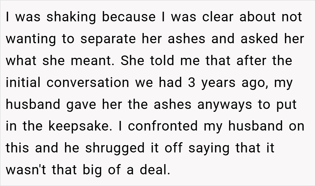 The situation takes a dramatic turn when the husband, dismissing the sacredness of those remains, gave away a portion of the ashes to create a keepsake for his stepdaughter. His cavalier attitude toward an act so emotionally charged has left the author heartbroken and questioning her future together. As the dust settles, she is forced to make a painful choice, igniting debates about respect, memory, and where the line should be drawn when it comes to personal loss.