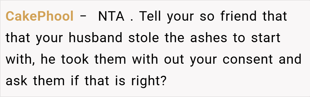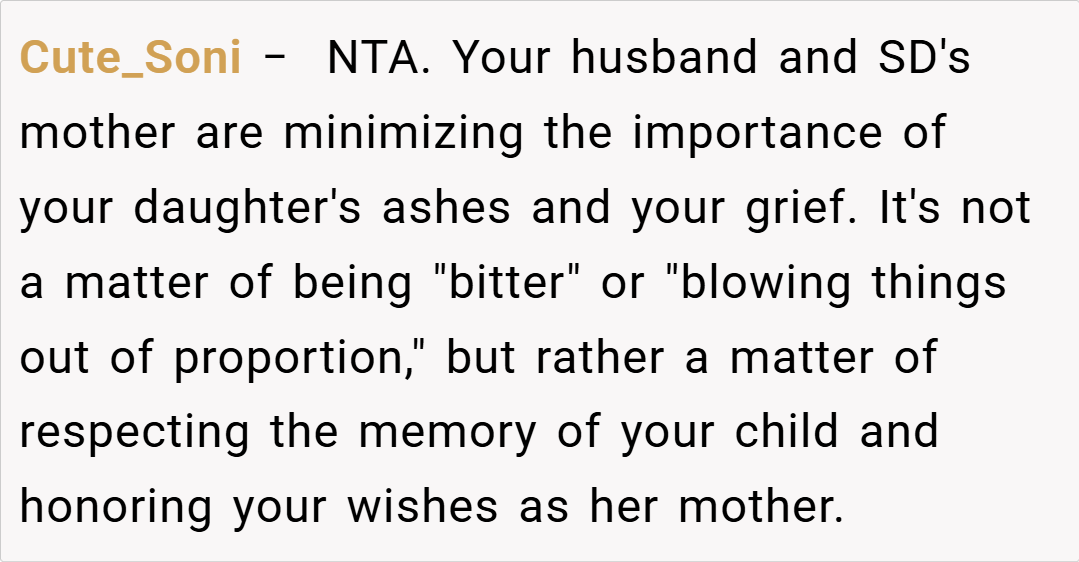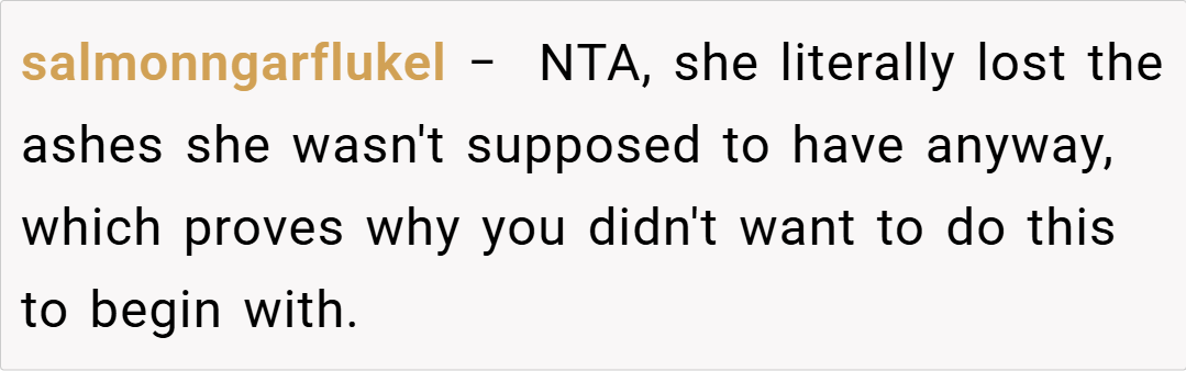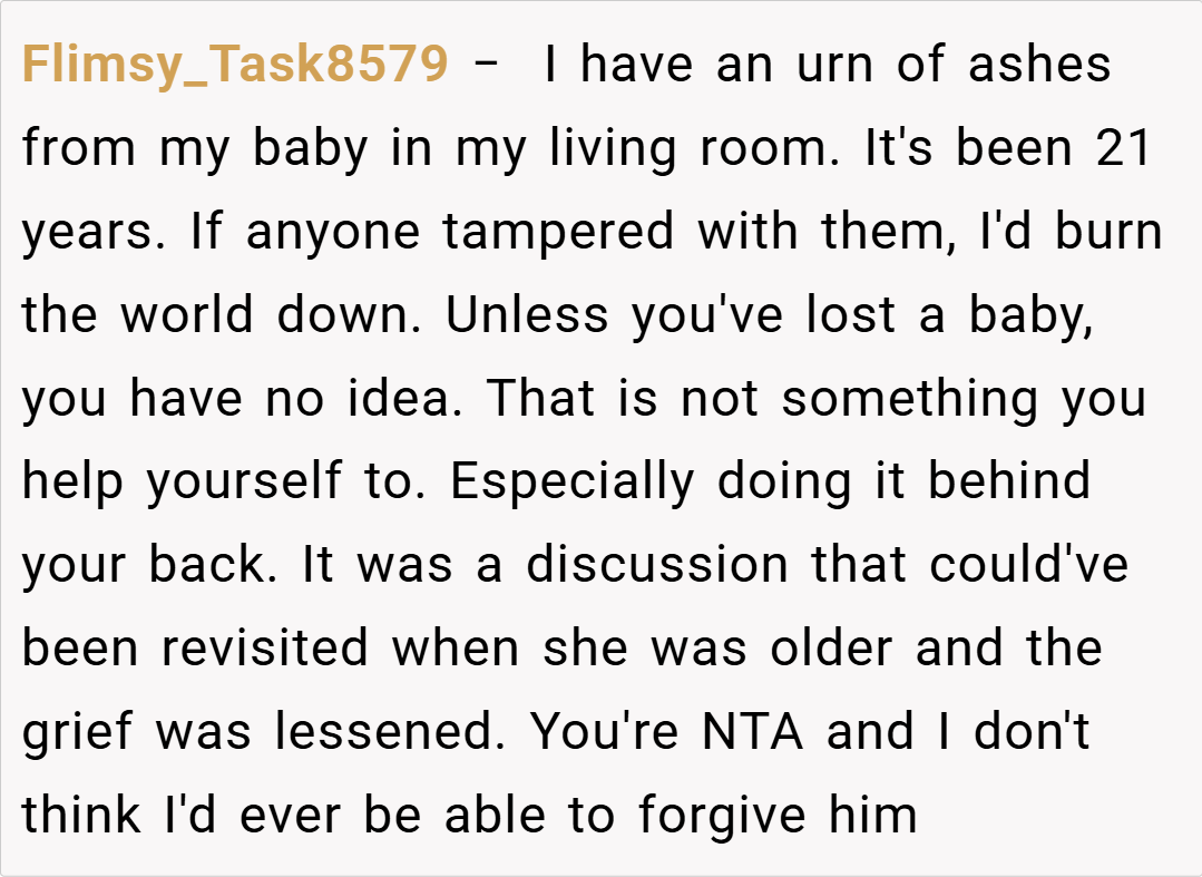 Many commenters express sympathy for the author, with several noting that certain lines, such as tampering with a loved one’s remains, should never be crossed. Others argue that while grief can alter perceptions, respect for sacred memories must remain unwavering. Amid humorous quips and empathetic messages, the consensus seems to lean toward the necessity of firm boundaries and the painful reality that sometimes love demands difficult choices.