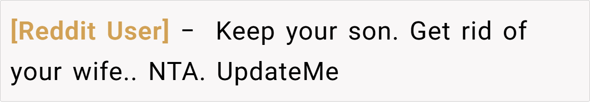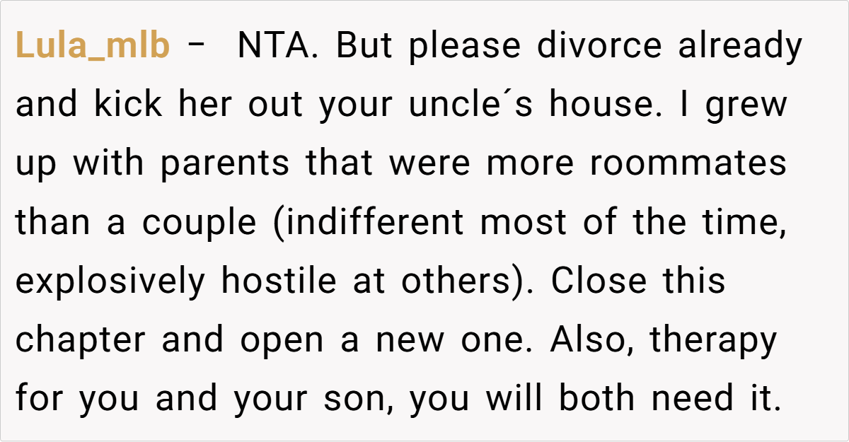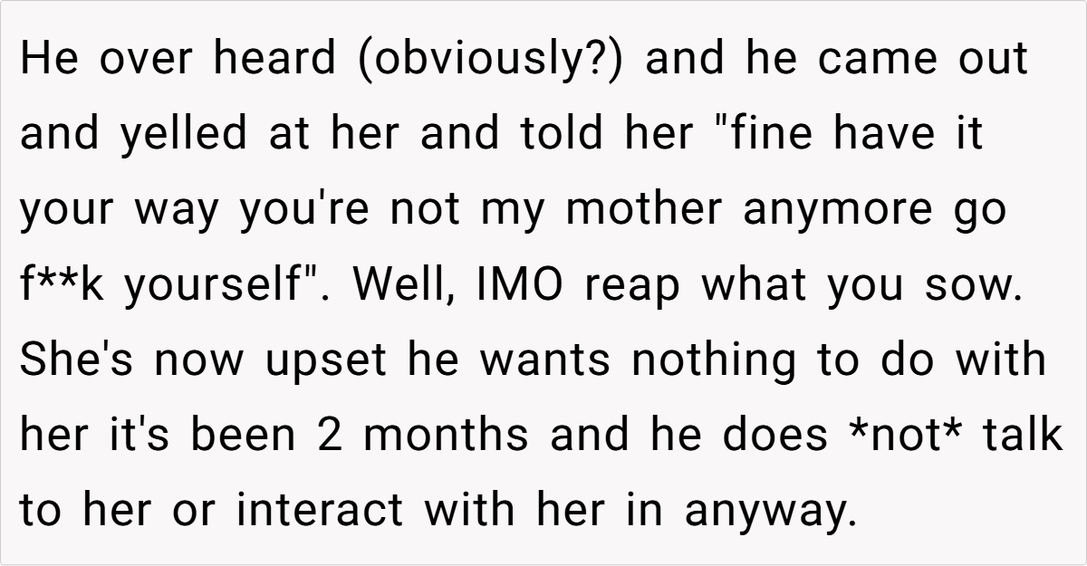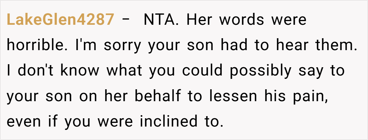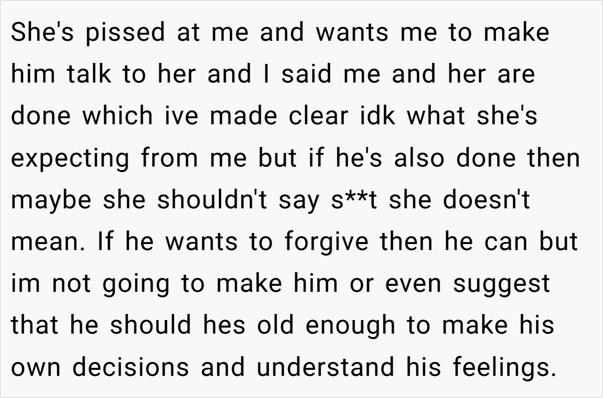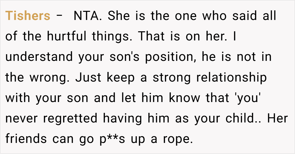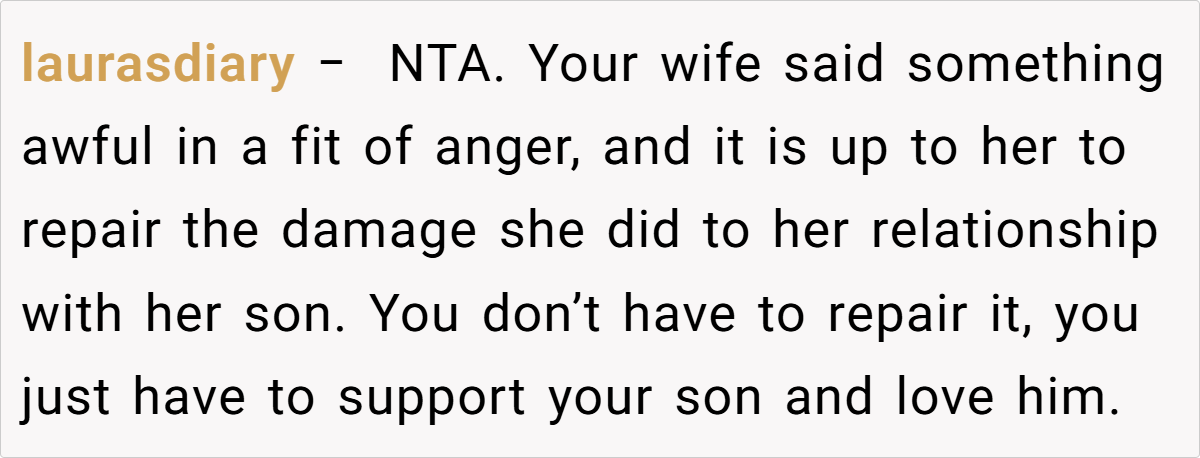 This story brings up the difficult balance between protecting a spouse and respecting a child’s right to define their own relationships. Is it wrong to refuse to force reconciliation when the pain runs deep? Or should a husband be expected to always back up his wife, even when it means overriding his son’s clearly expressed feelings?
