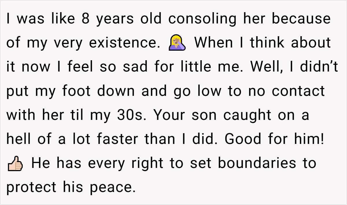 Family therapy and trauma experts emphasize that when a parent’s behavior consistently undermines a child’s emotional well‑being, the child’s decision to distance themselves can be a healthy, albeit painful, act of self-preservation.