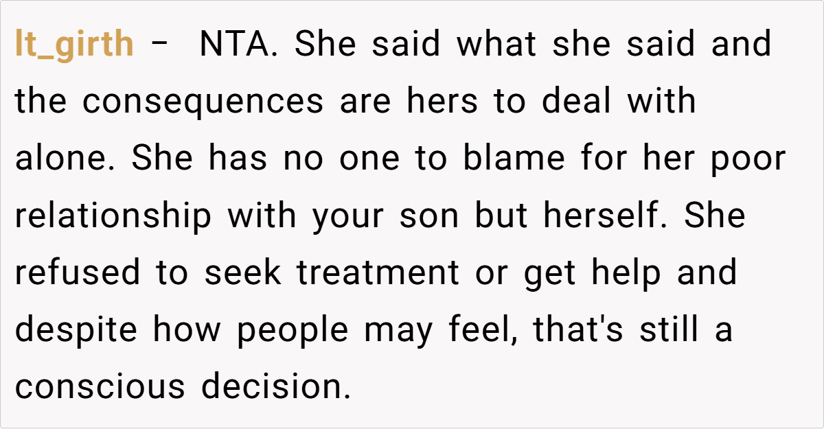 Many Reddit users echo similar sentiments. One commenter wrote, “If your child is old enough to decide for himself and is hurt by your behavior, you’re not responsible for forcing a relationship.” Another remarked, “It’s not about backing someone up blindly; it’s about allowing space for healing on everyone’s terms.” Some argue that while family support is important, personal boundaries and the need for individual agency are equally critical.