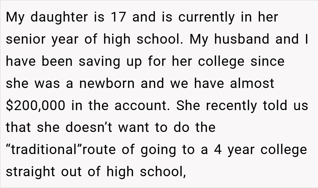 Deciding how to manage a college fund can be as challenging as it is emotional—especially when your daughter’s plans diverge sharply from the traditional path you envisioned. In today’s story, a 35-year-old parent recounts the heated disagreement with their 17-year-old daughter about accessing nearly $200,000 saved for college.