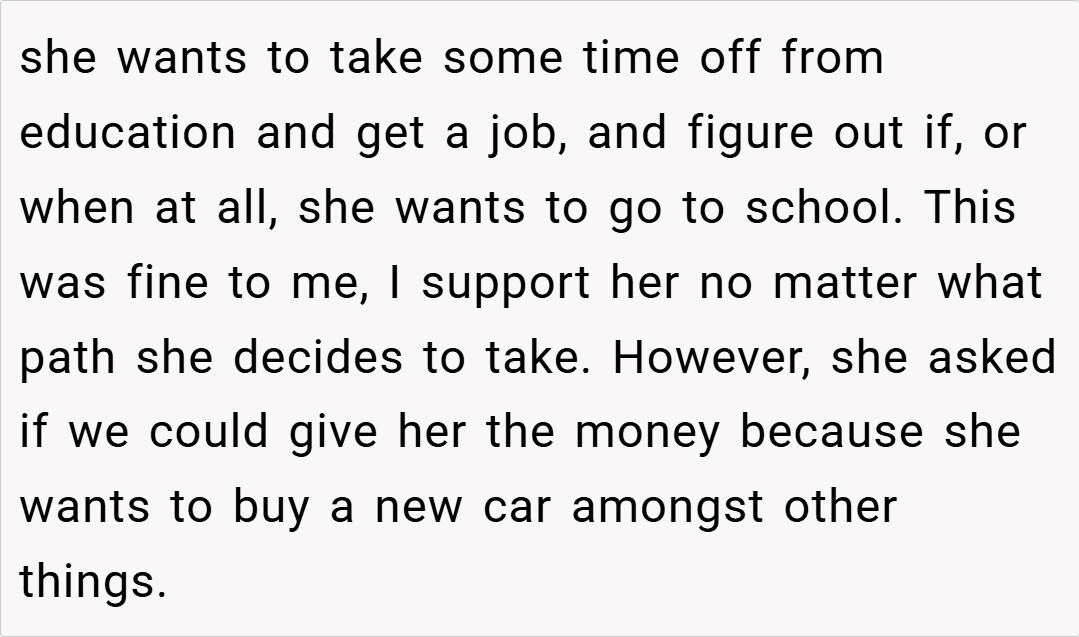 While the daughter, now a high school senior, has chosen to take a break from academics and get a job, she wants to use the money for a new car and other immediate expenses. The parent, however, insists on holding onto the funds so that there will be resources available if and when she decides to attend college later.