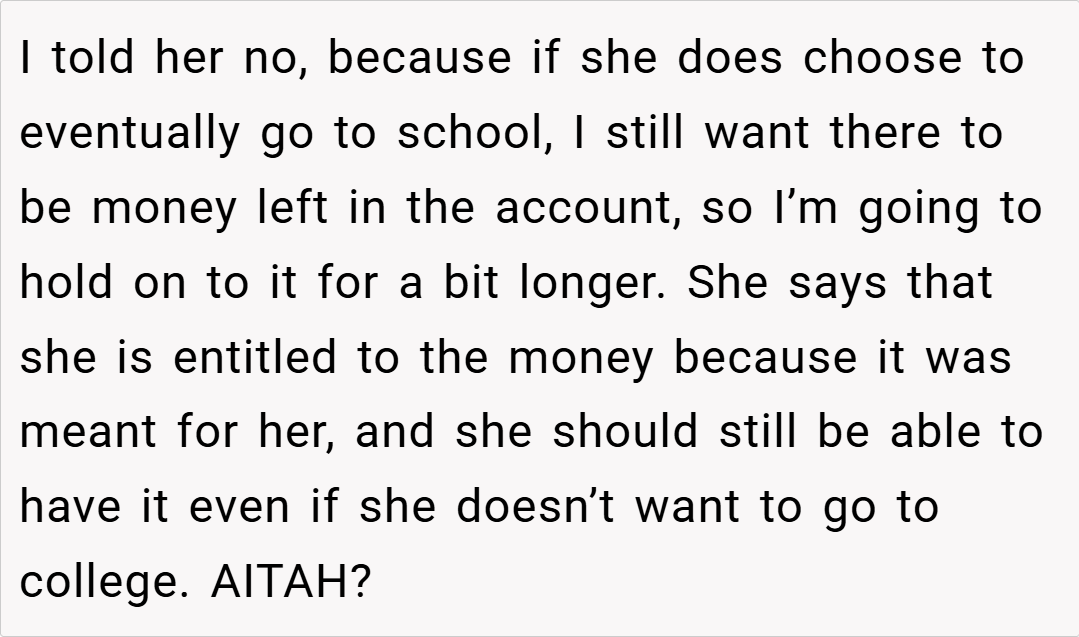 while the daughter argues that the money was always meant for her benefit, regardless of the traditional college route. As emotions run high and accusations fly, the question remains: is it unreasonable for a parent to withhold the funds, or is it a necessary precaution for securing her future?
