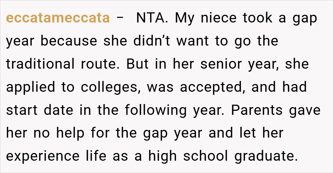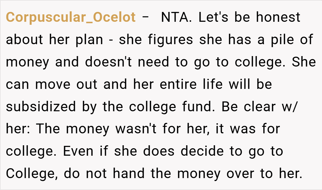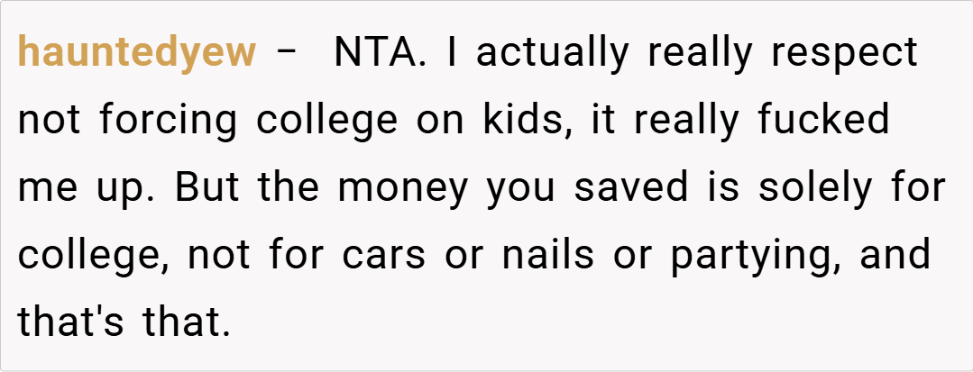Several redditors expressed strong support for the parent’s decision. One user commented, “After saving for years, that college fund isn’t just cash—it’s a safety net for your future. It’s completely fair to insist on keeping it intact, even if your daughter doesn’t want to follow the traditional route.”