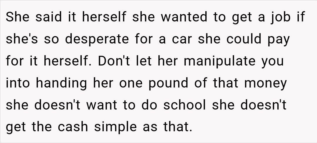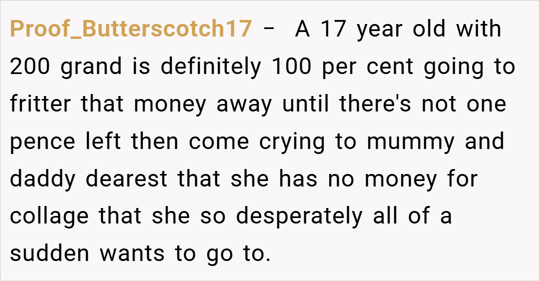 With both sides holding strong beliefs about entitlement and long-term planning, this situation has left the family in a bitter standoff. The tension here isn’t just about money—it’s about differing visions for the future. The parent sees the college fund as a safety net, built from years of sacrifice,