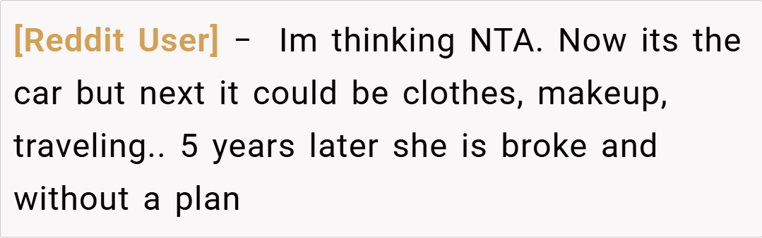 Do you believe that personal entitlement should override long-term planning, or is patience and foresight the key? Let’s discuss how we can navigate these tricky waters of family finances and personal independence.