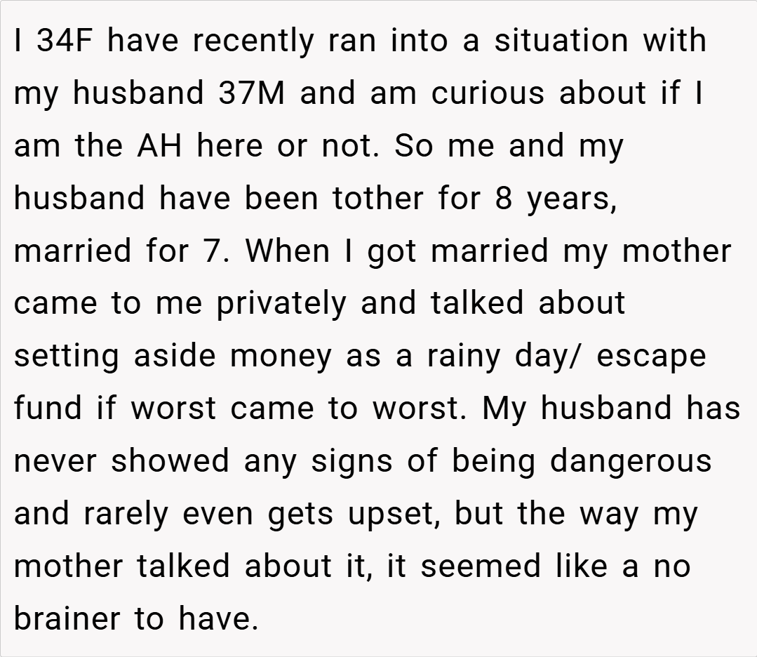 In relationships, money matters can be one of the trickiest subjects to navigate—especially when it involves “escape money” that one partner set aside as a precaution. In this case, the OP, a 34‑year‑old woman, explains that she has been saving a dedicated “escape account” since her marriage began. Initially advised by her mother to have such a fund, OP maintained the habit even though her husband, a 37‑year‑old man with a mid six‐figure income,