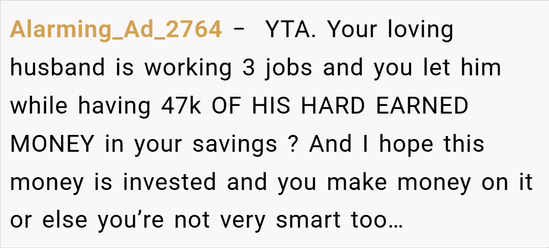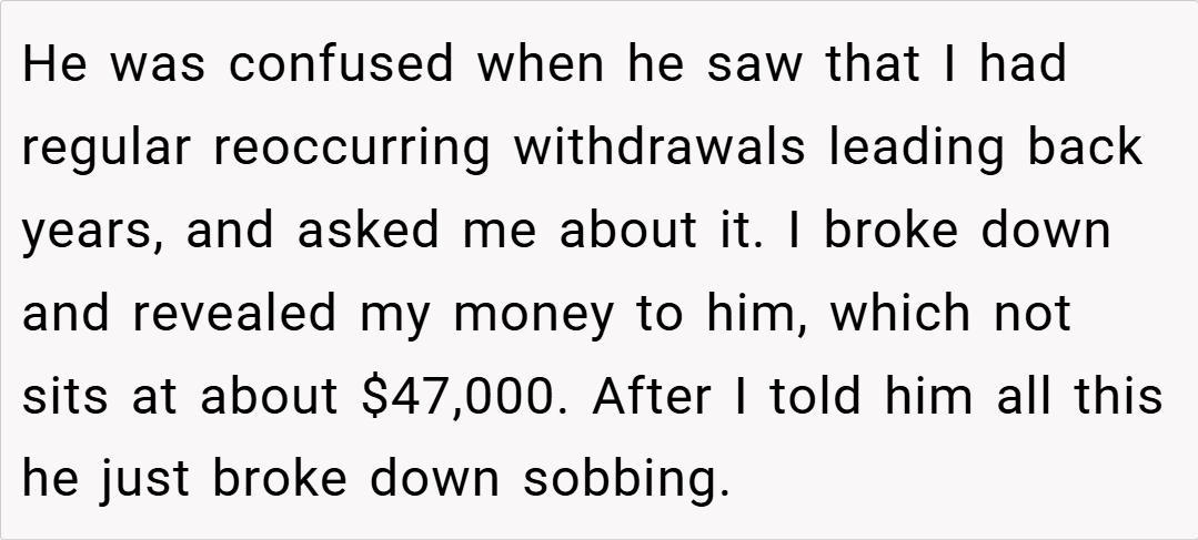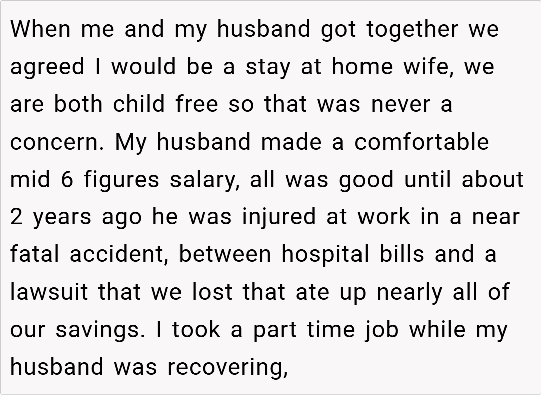 never showed any signs of financial or emotional instability. However, about two years ago, after her husband suffered a near-fatal work injury that decimated their savings, the dynamics shifted. Now, with her husband working two full-time jobs (and even driving for Uber on his off days), OP has continued to save, albeit at a reduced rate, and now the account holds roughly $47,000.