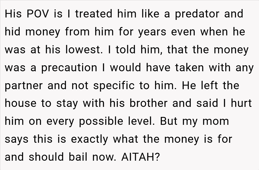 These perspectives suggest that OP’s actions are not inherently wrong—financial safeguards are a well-established strategy, especially in unpredictable situations. However, the dispute seems to stem from a communication breakdown about shared finances, highlighting the need for clear, ongoing discussions in long-term relationships.
