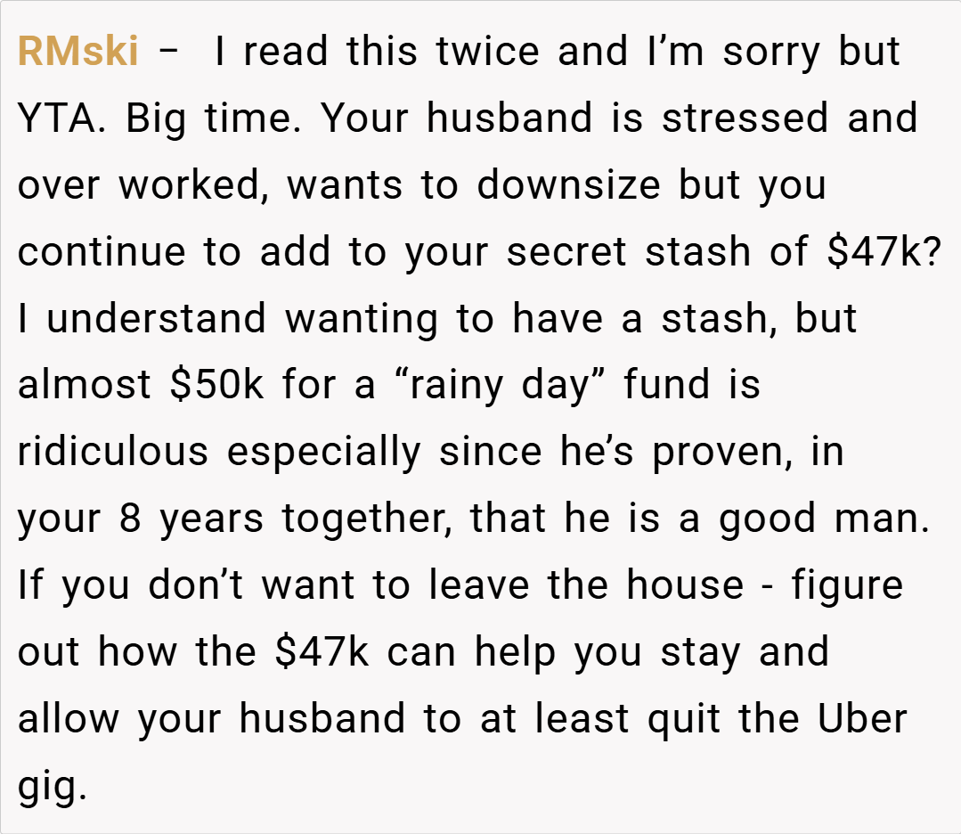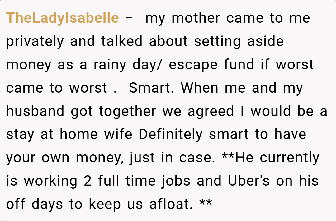 In conclusion, OP’s decision to maintain her “escape money” fund appears to be a prudent and self-protective measure, especially given the financial turmoil they experienced following her husband’s accident. Although her husband feels betrayed by the discovery, the practice itself isn’t inherently wrong—it’s a widely recommended strategy for safeguarding against unforeseen crises. The core issue here is not the existence of the fund, but rather the lack of communication about it over the years.