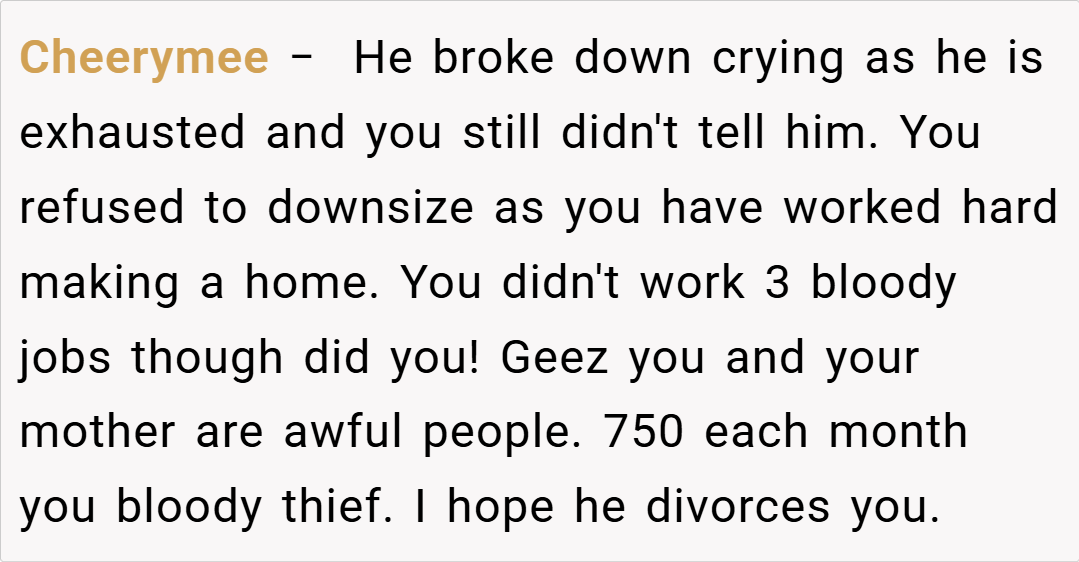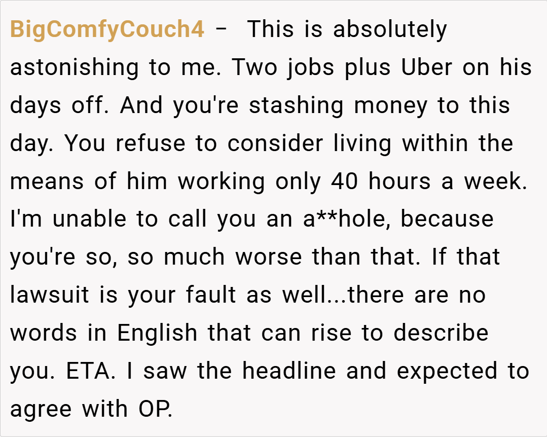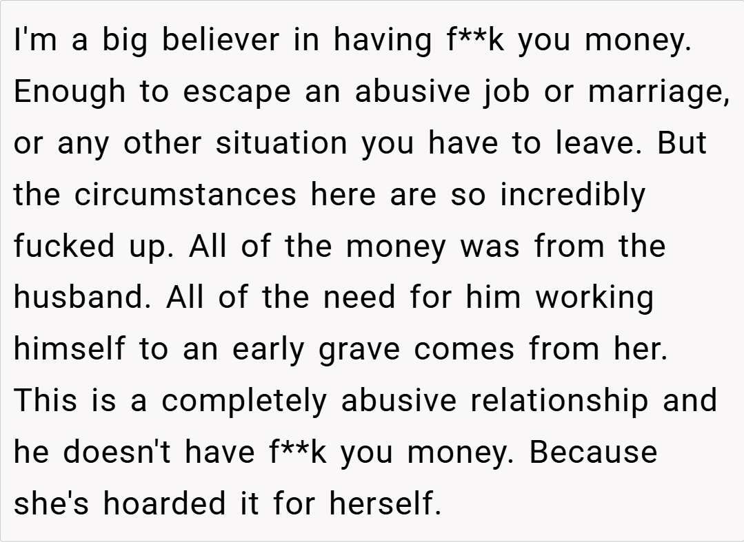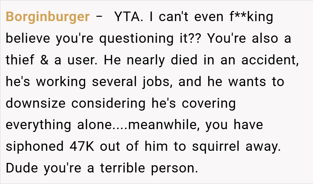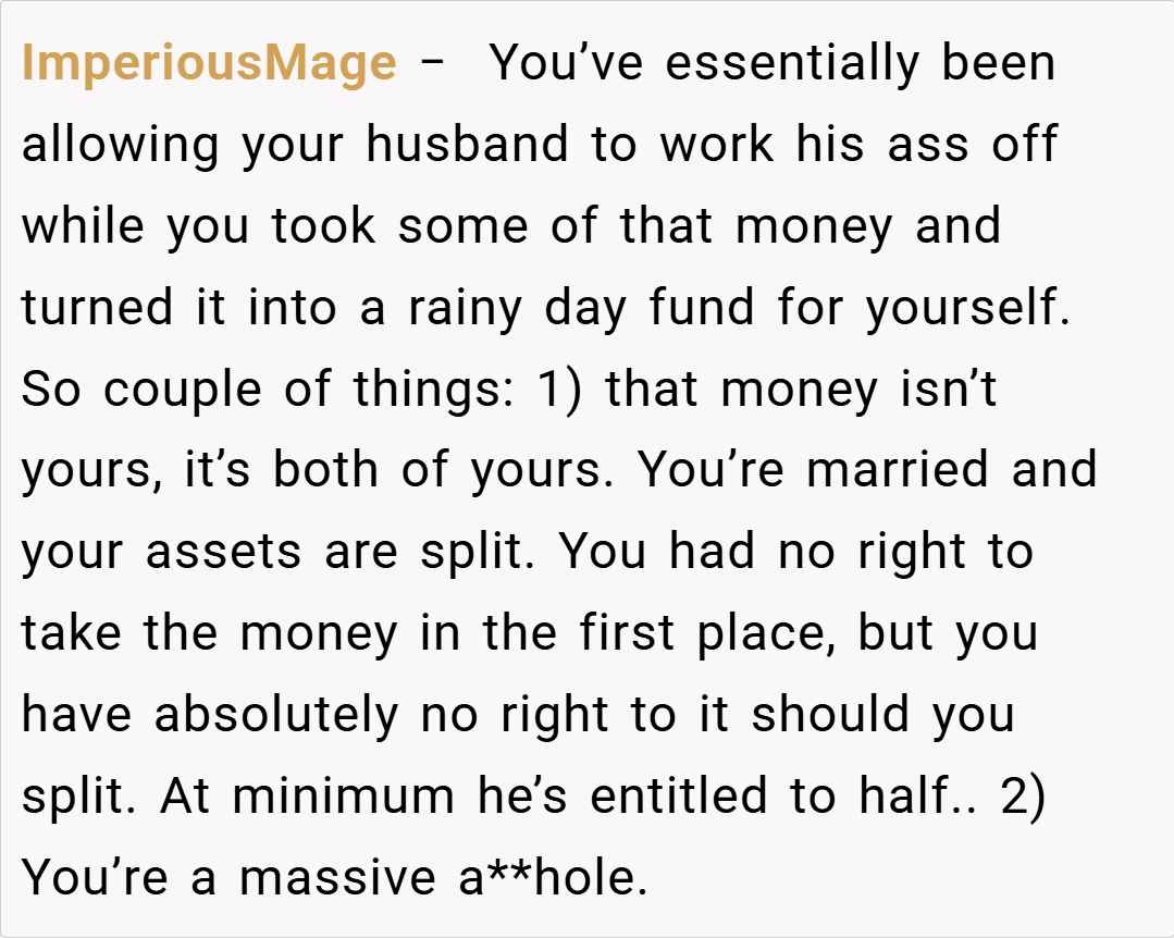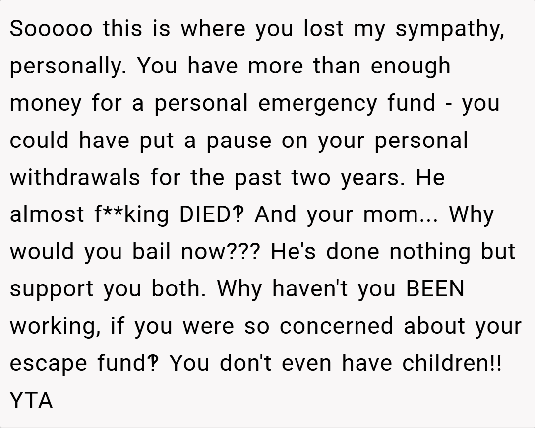 Many redditors argue that having an escape fund is smart, especially given the financial crisis the couple faced. “If you’re trying to protect yourself after a near-fatal accident that wiped out your savings, it makes sense to have a backup. Your husband should have been more supportive of your proactive approach,” one user commented.