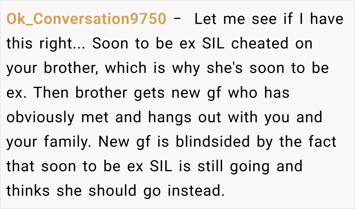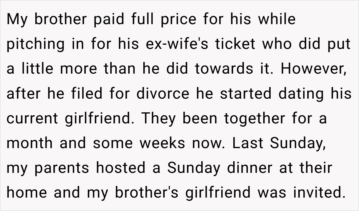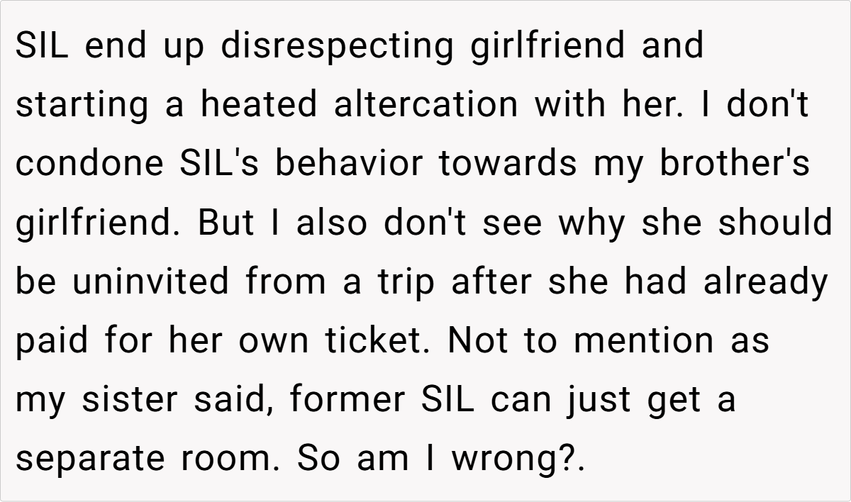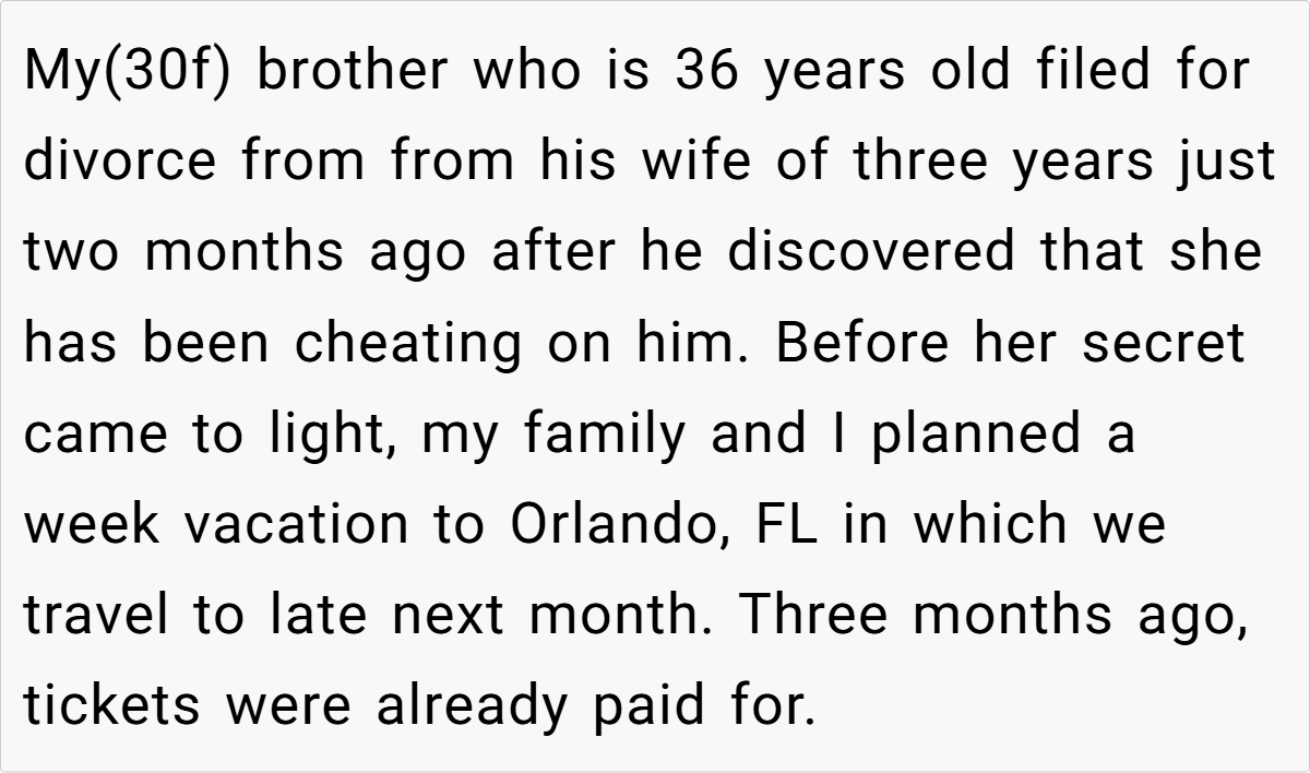 Family vacations can become a flashpoint for unresolved tensions and lingering resentments. In this case, our OP—a 30‑year‑old sister—finds herself caught in a conflict involving her 36‑year‑old brother, his soon-to-be ex-wife, and his new girlfriend. After her brother filed for divorce due to infidelity, he had already contributed toward his ex-wife’s plane ticket for an upcoming Orlando trip, even as he began dating his new girlfriend.