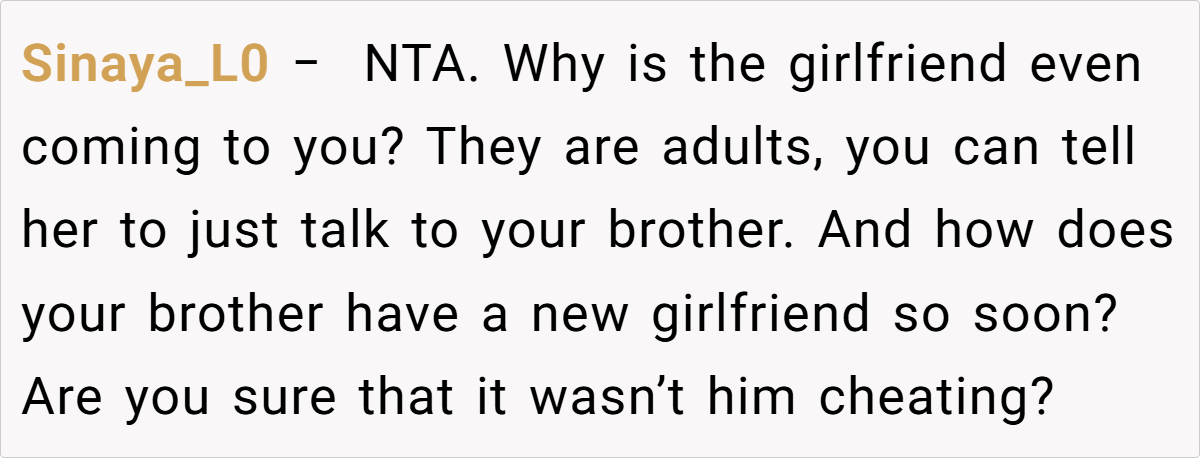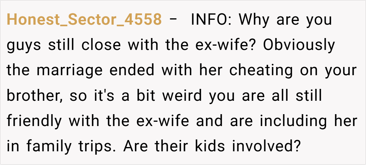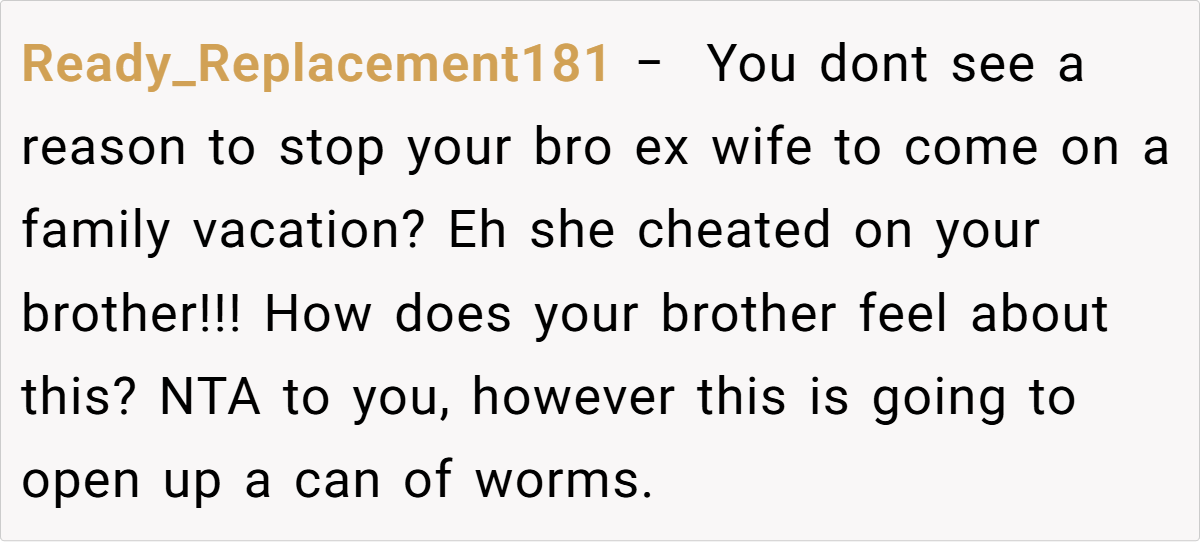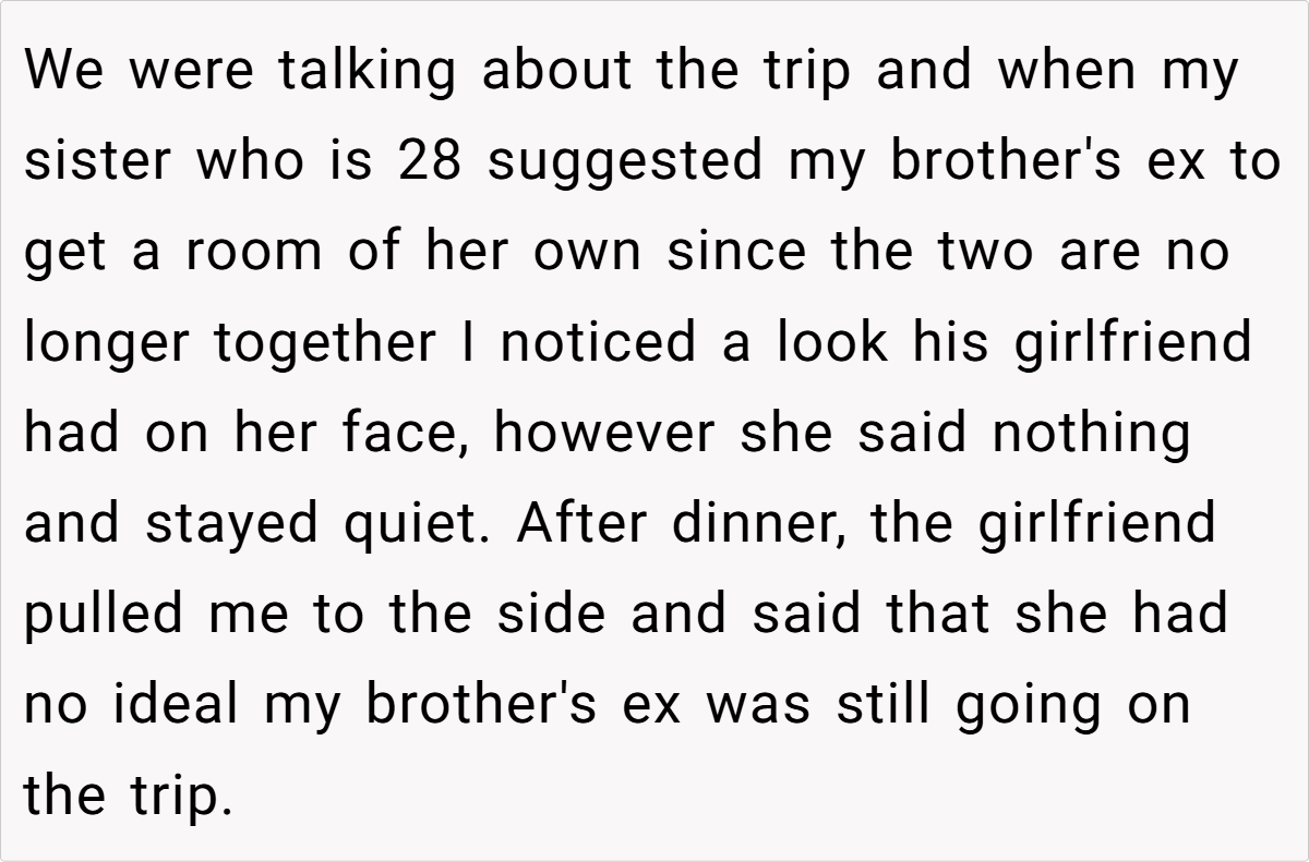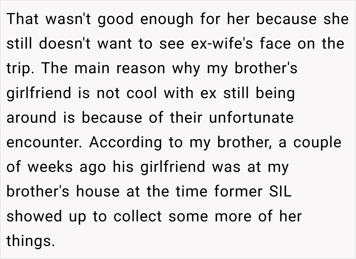Family vacations can become a flashpoint for unresolved tensions and lingering resentments. In this case, our OP—a 30‑year‑old sister—finds herself caught in a conflict involving her 36‑year‑old brother, his soon-to-be ex-wife, and his new girlfriend. After her brother filed for divorce due to infidelity, he had already contributed toward his ex-wife’s plane ticket for an upcoming Orlando trip, even as he began dating his new girlfriend.