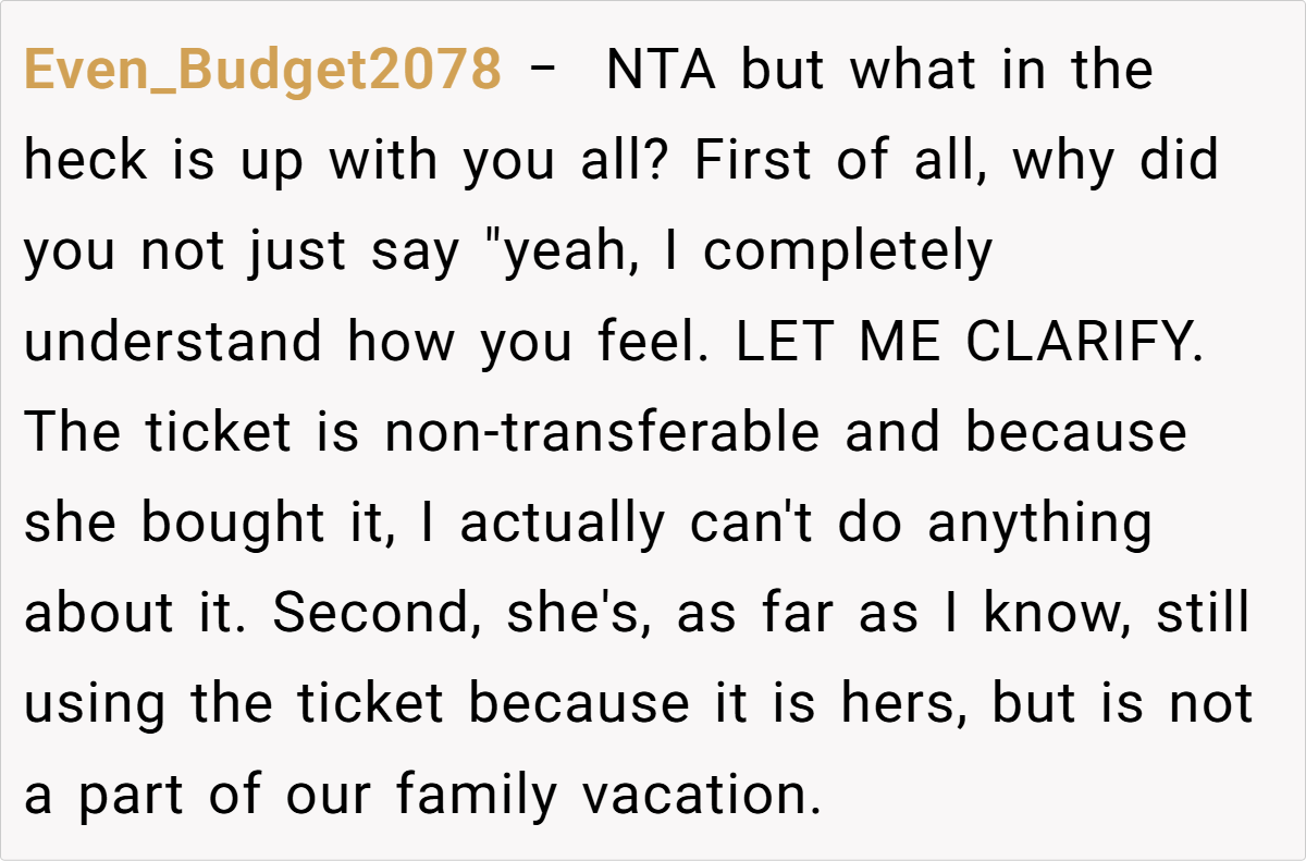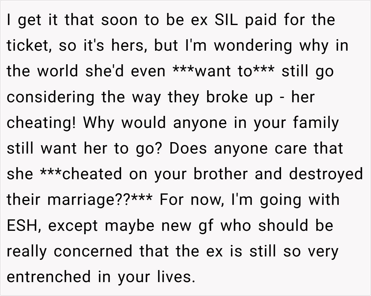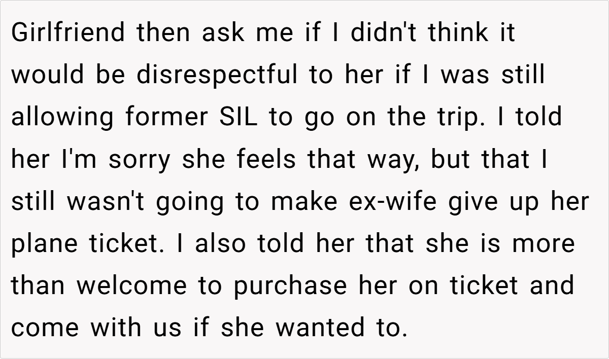 This situation raises the question: Should past interpersonal conflicts dictate the financial agreements made before a breakup? While the OP’s stance is rooted in fairness—ensuring that the ex-wife retains her paid-for ticket—others feel that accommodating the new girlfriend’s discomfort might help avoid further family tension.