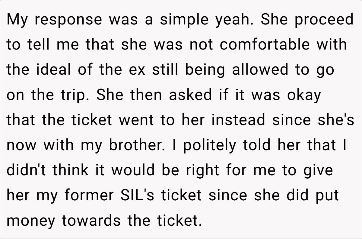‘AITAH for not making my brother’s soon-to-be ex-wife give up her plane ticket to his current girlfriend?’