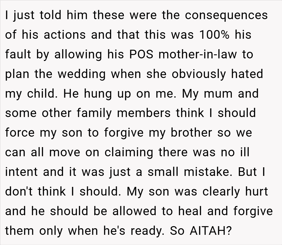 ‘AITAH for not making my son forgive my brother after he was uninvited from his wedding?’