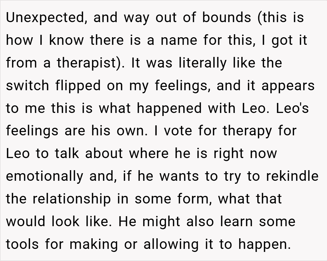 For the OP, his ex’s failure to provide the emotional support he needed is not just a minor grievance—it’s the culmination of years of imbalance. Though divorce is always a painful outcome, experts agree that a relationship in which one partner consistently ignores the emotional needs of the other is unsustainable in the long run. The OP’s ultimatum, harsh as it may sound, is a reflection of his deep hurt and the stark reality that mutual support is essential for any lasting partnership.
