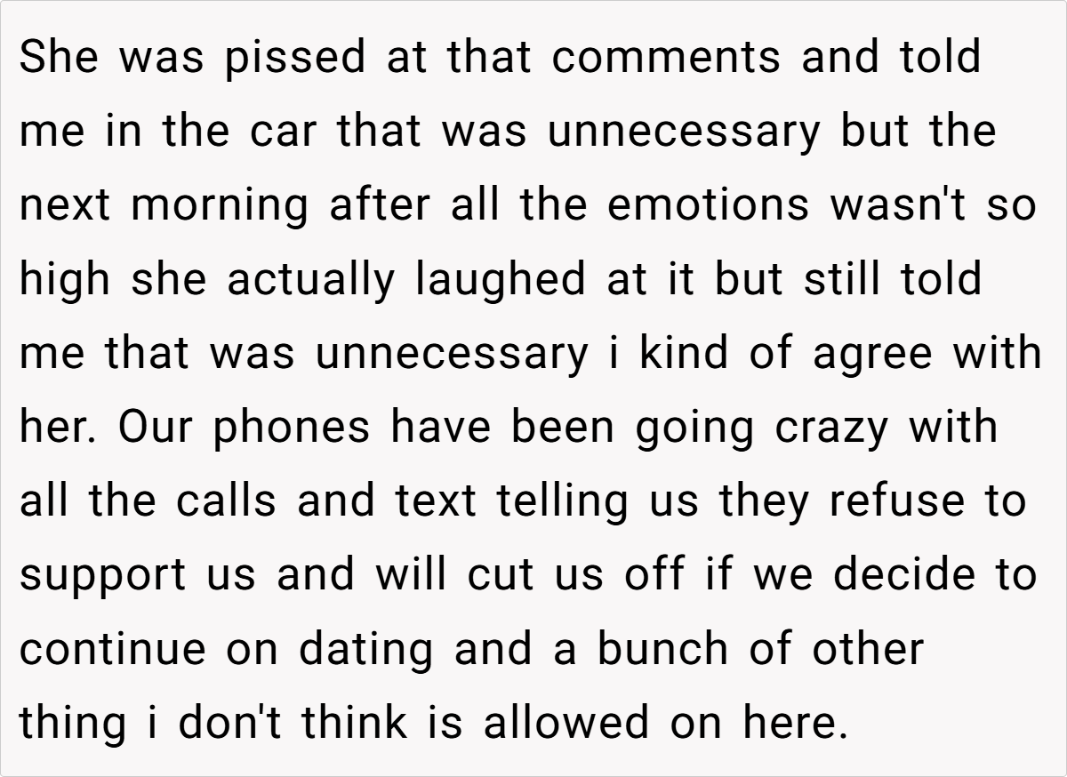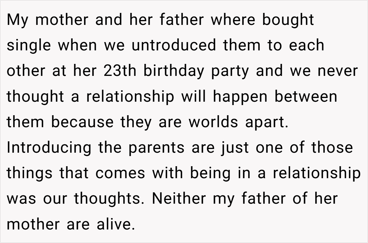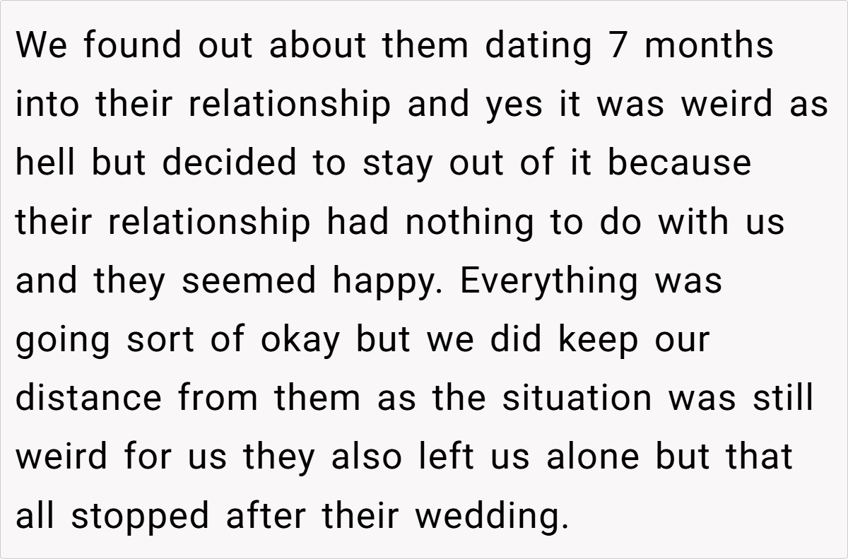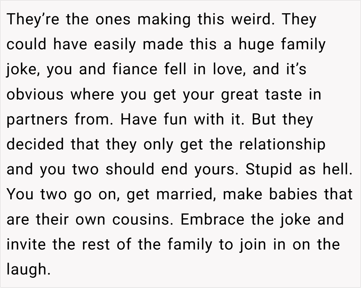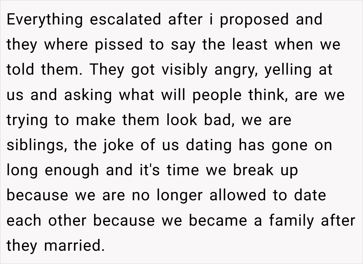 The OP’s narrative paints a picture of longstanding love challenged by the shock of unconventional family ties. On one hand, the couple reminds us that they began dating long before their parents’ unexpected union. On the other hand, their families are struggling with the implications of a romance born out of a blended, albeit complicated, background. Such scenarios expose the tension between personal happiness and societal expectations. It’s a scenario that’s as intriguing as it is controversial, leaving us to ponder: Should the past dictate the future of love?