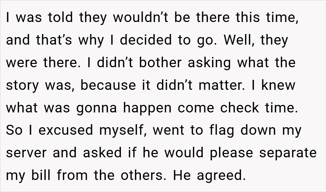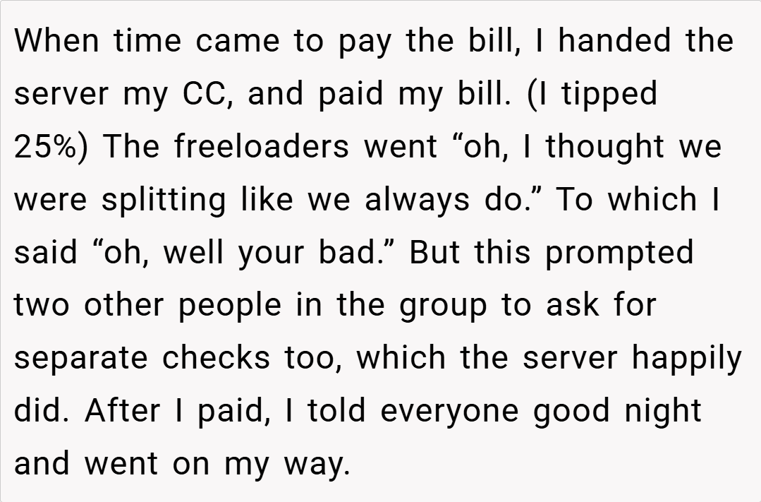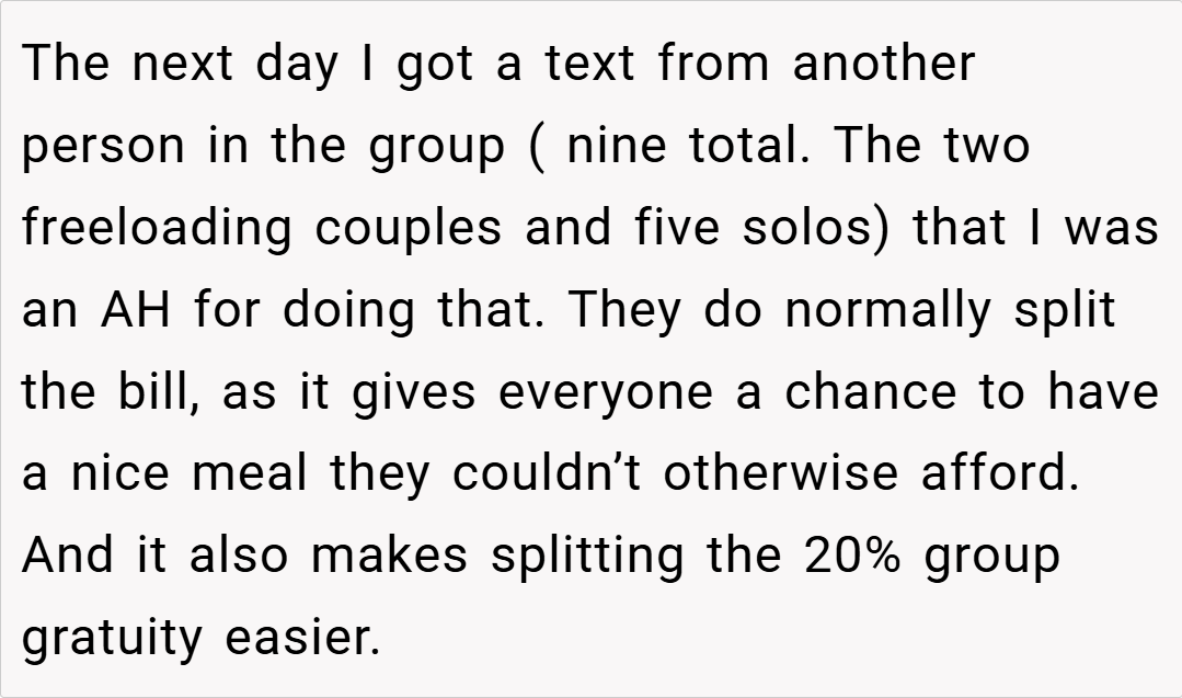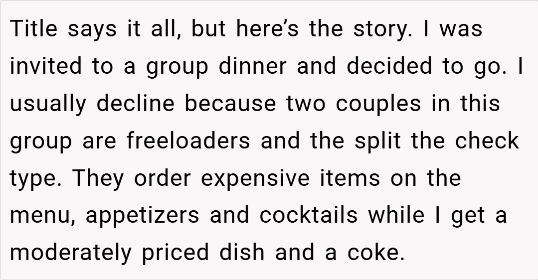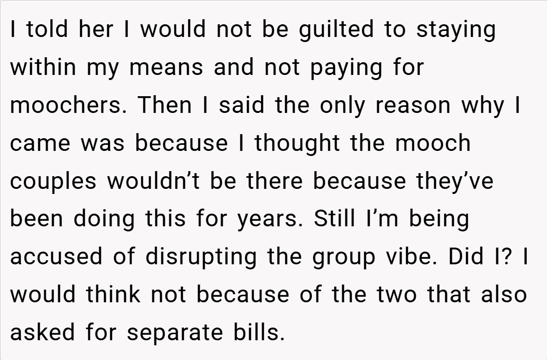 I was under the impression that these couples wouldn’t be attending this particular dinner, so I went along with the plan. However, when they did show up, I anticipated the familiar pattern at check time. Determined to avoid subsidizing lavish orders that weren’t part of my budget, I took preemptive action. What happened next sparked debate within the group, leaving me to wonder: did I disrupt the group vibe, or was I simply standing up for my own financial boundaries?