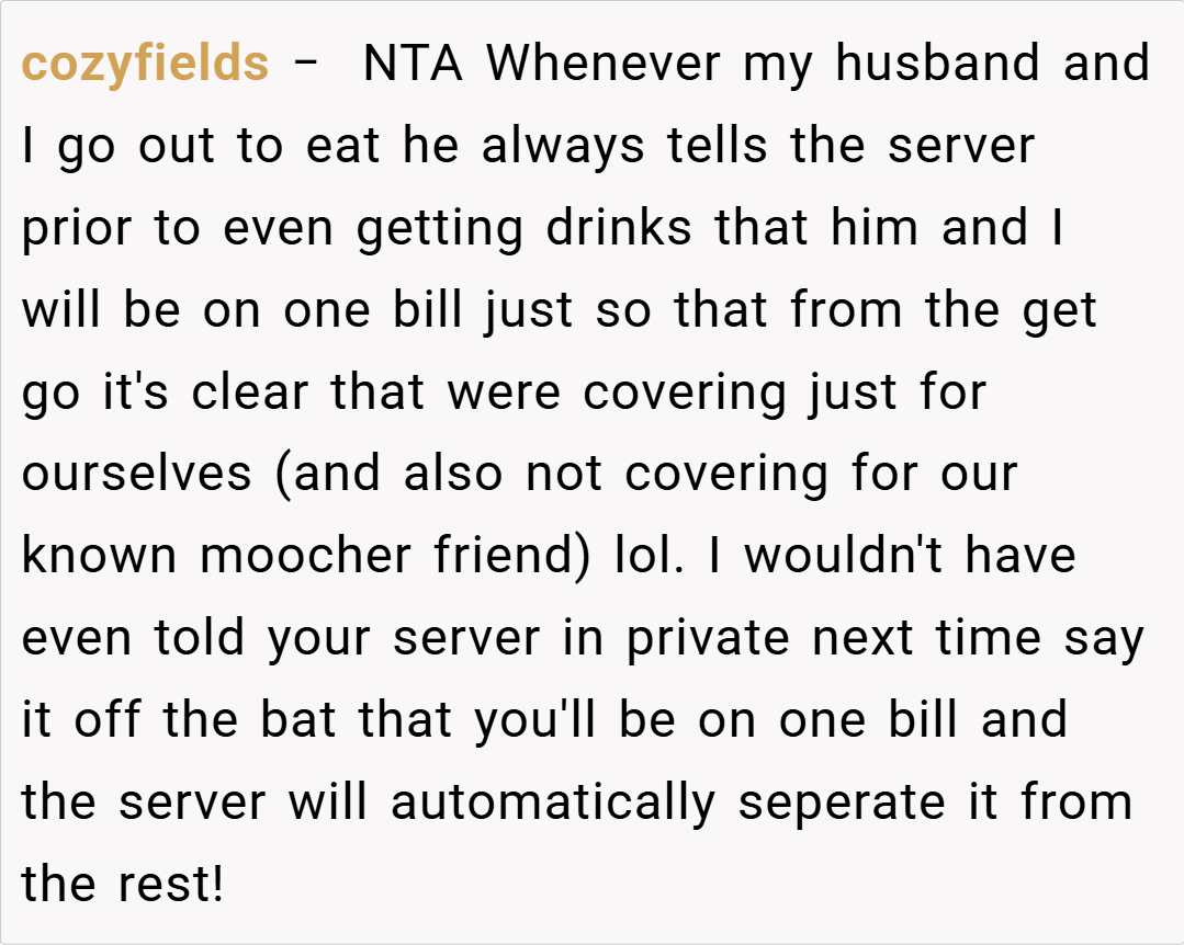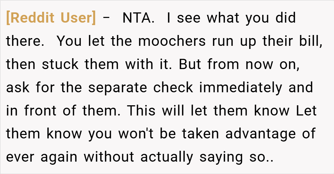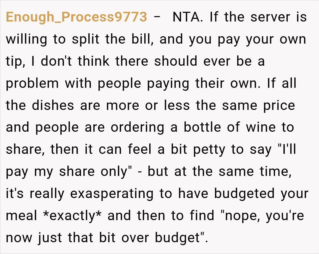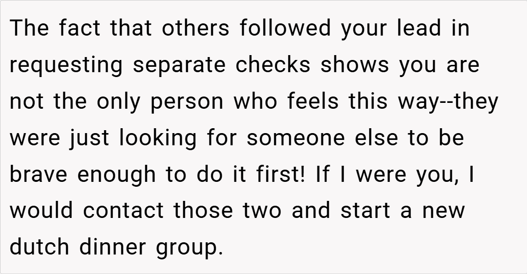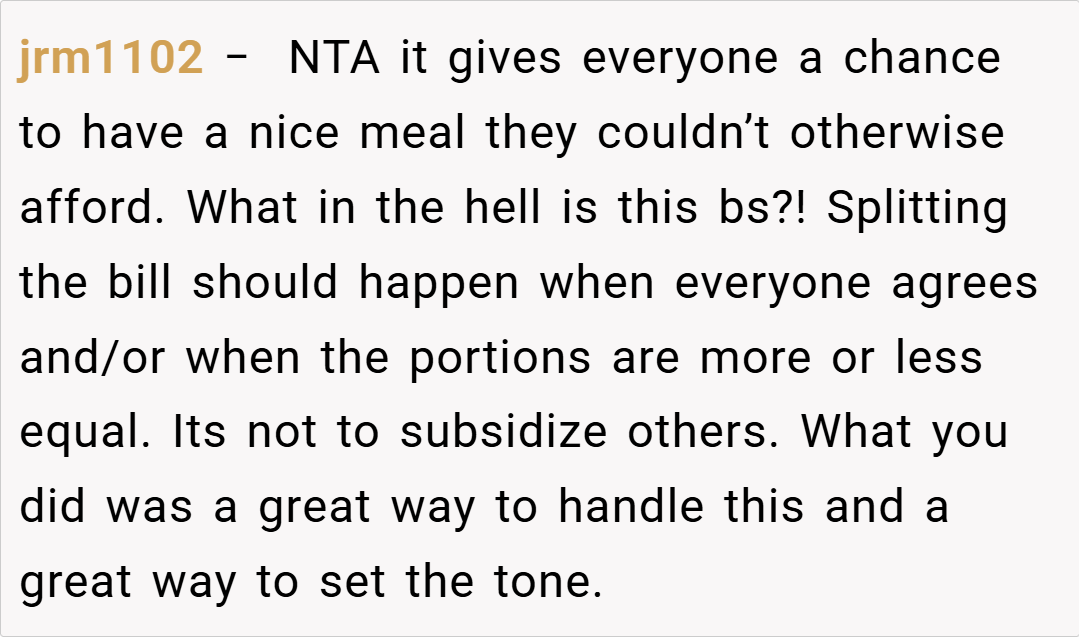 Here are some hot takes from the Reddit community—candid, humorous, and refreshingly straightforward. Many users applauded the decision to request a separate check, arguing that no one should be forced to cover the cost of others’ extravagant meals. They noted that if even a few people are already opting for separate bills, it clearly indicates a shared sentiment about fairness.