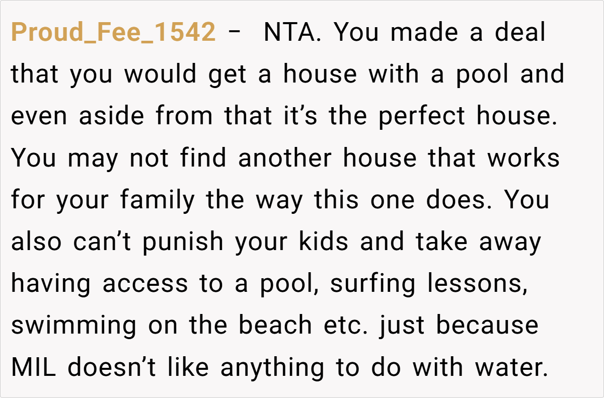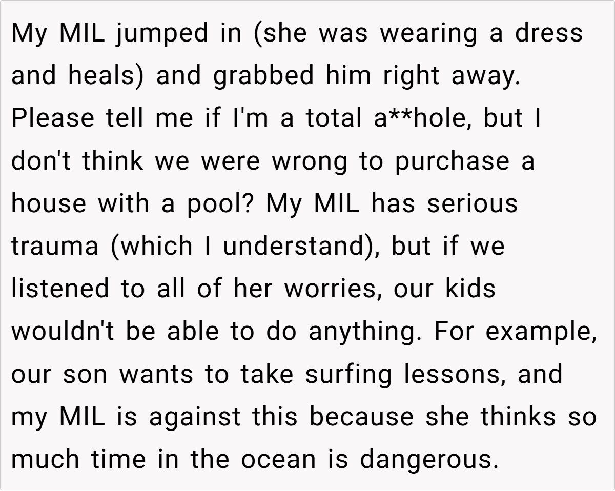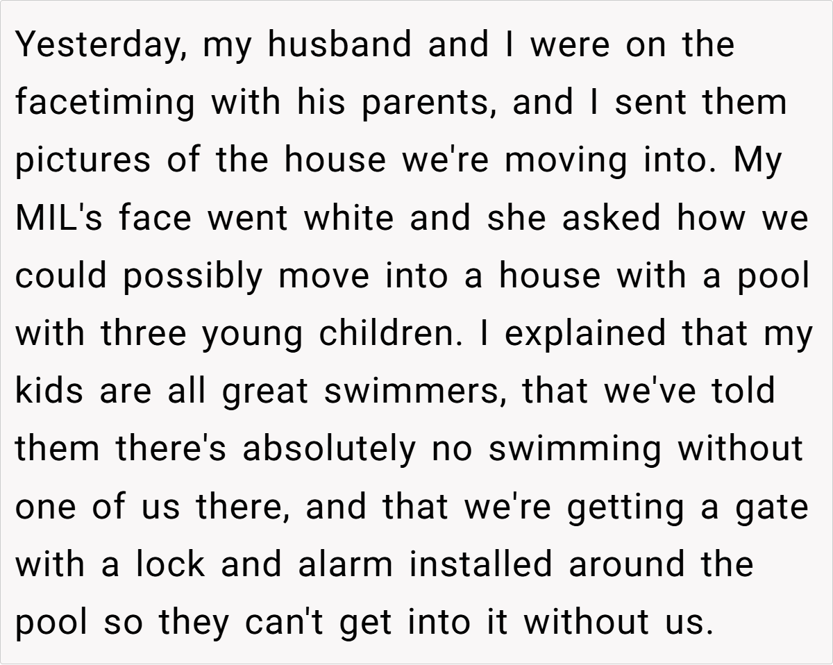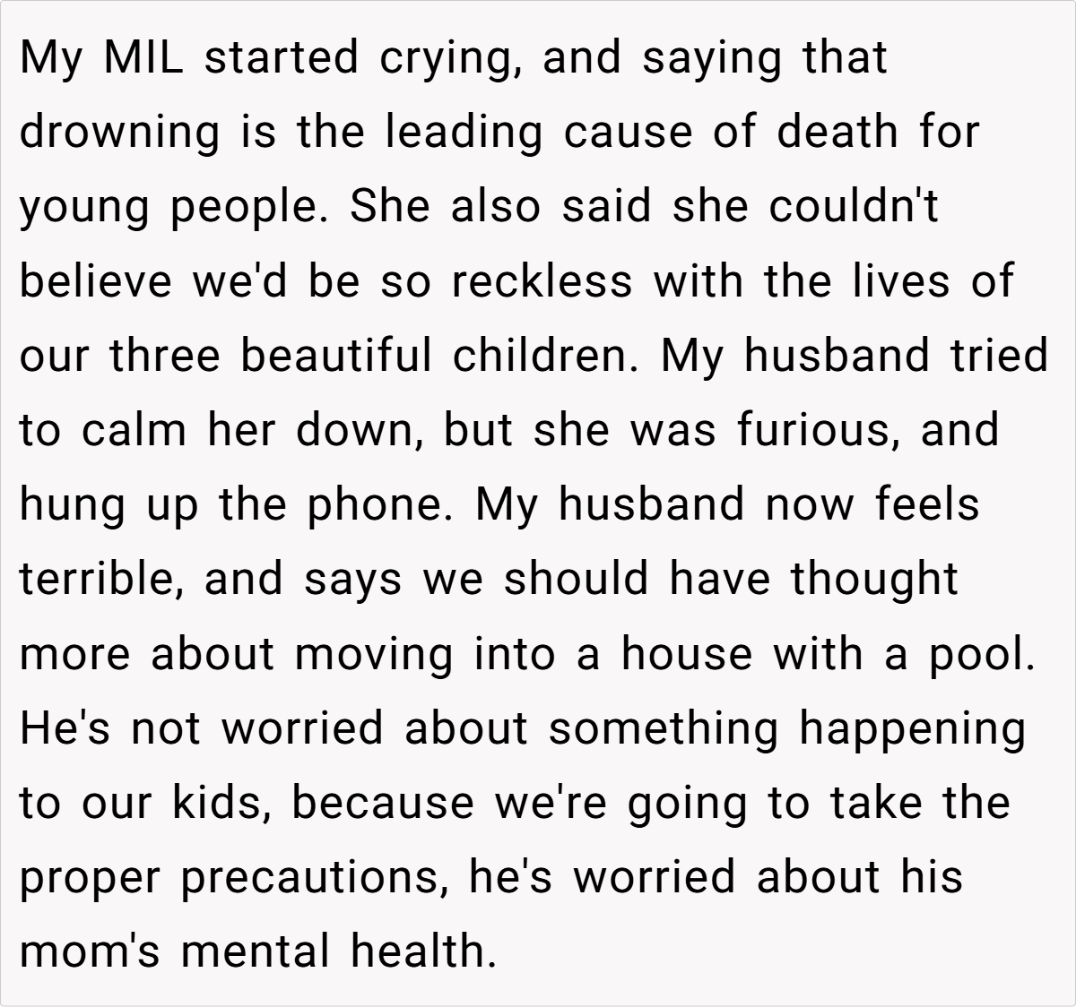 In the end, the decision to purchase a home with a pool was made with careful consideration and appropriate safety measures in place. While the MIL’s emotional response is understandable given her tragic past, it seems that her reaction is more about her own unresolved trauma than any actual recklessness on the part of the new homeowners. The poster and her husband are simply trying to build a life that brings them joy and meets their lifestyle needs without sacrificing safety.