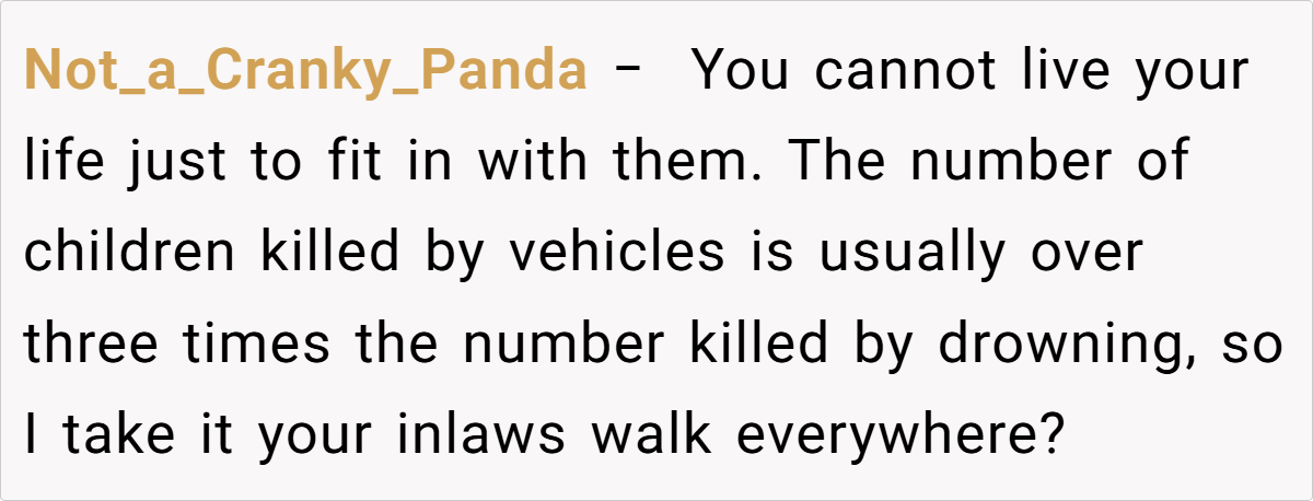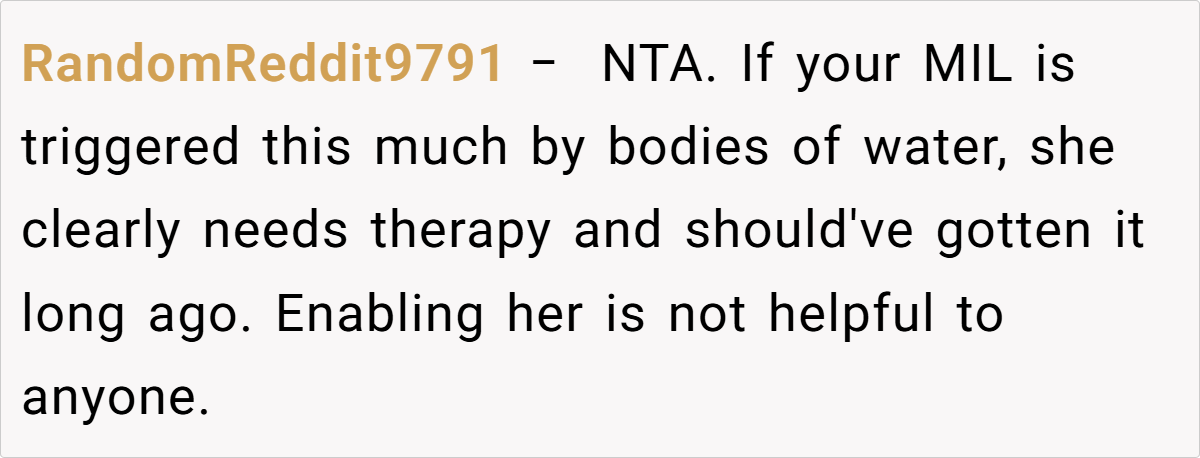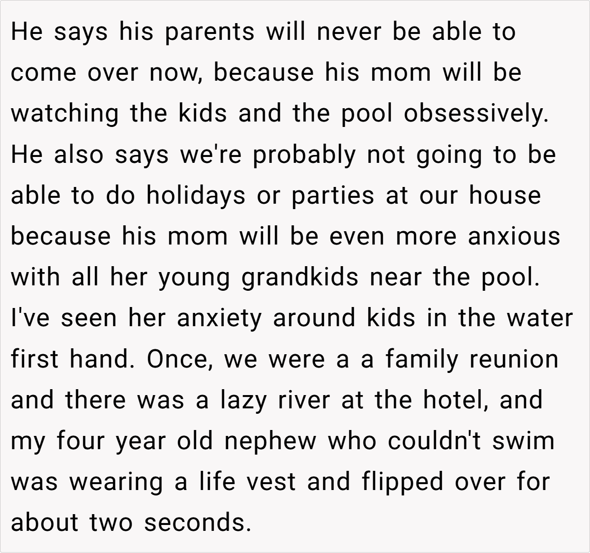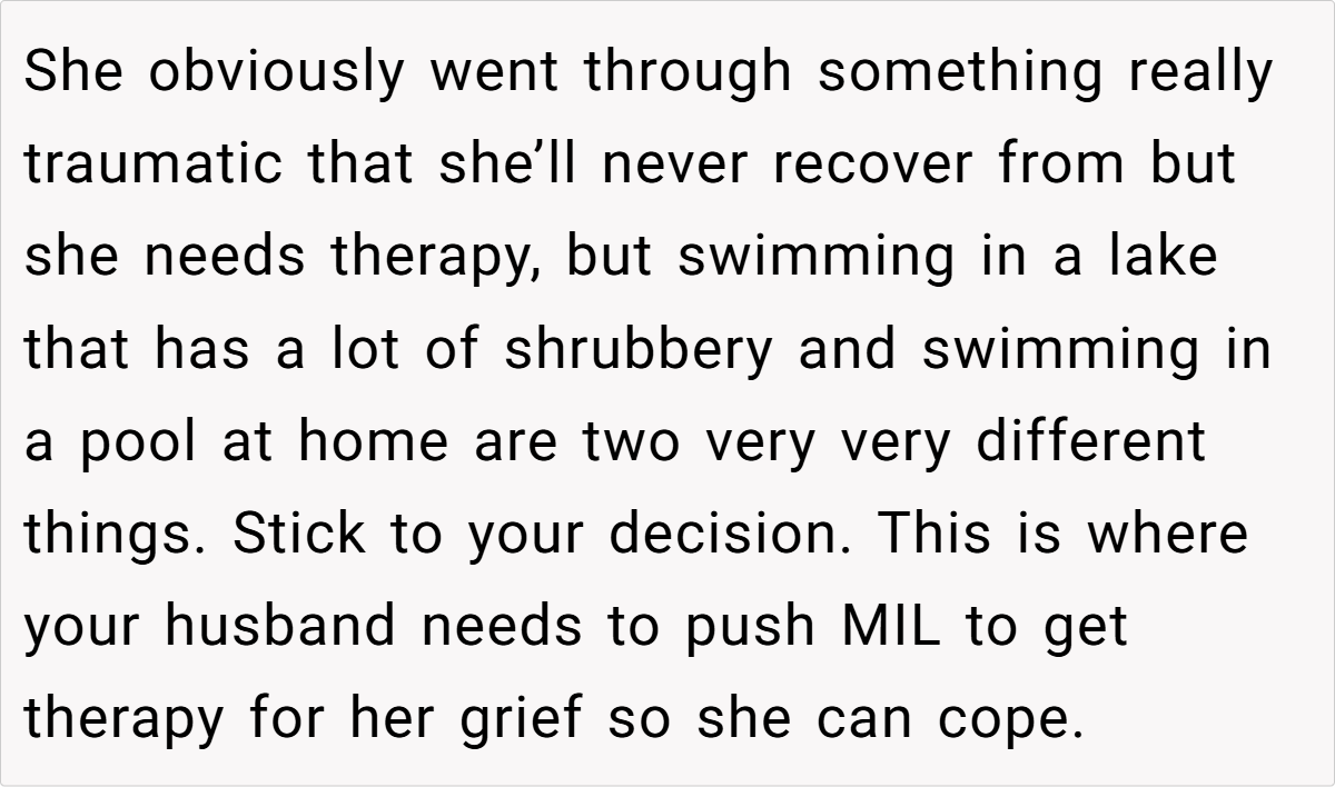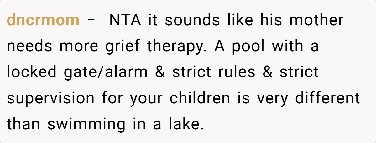 Others, however, express empathy for the MIL, suggesting that perhaps a more gradual introduction to the idea of a pool might have lessened her anxiety. Still, the prevailing sentiment is that the family’s right to create a home that suits their needs including a safe, modern pool environment should take precedence over a relative’s unresolved grief.