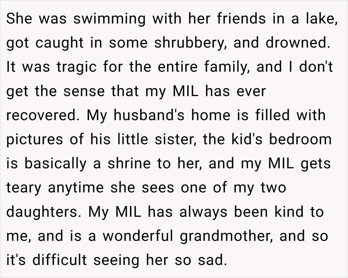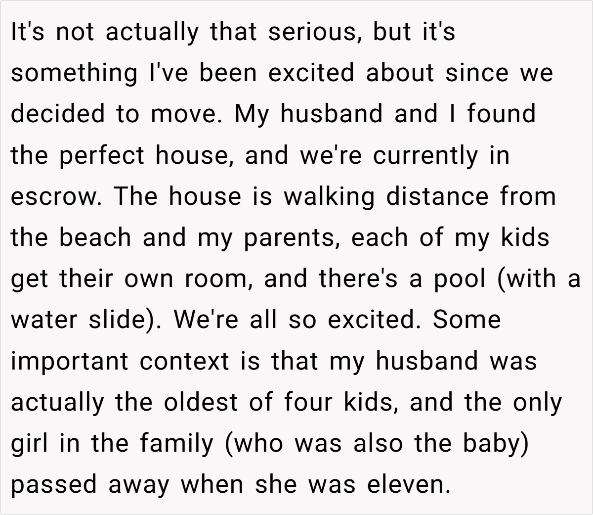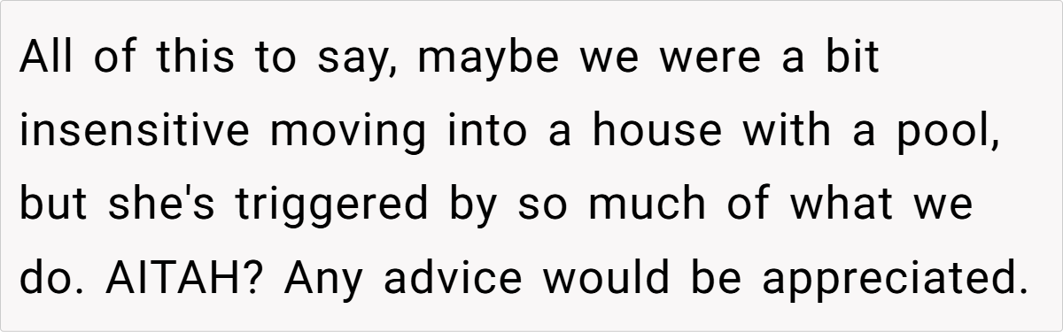 So, AITA? It appears that while the MIL’s feelings are valid, the choice to purchase the home and its pool isn’t inherently irresponsible. The tension arises from the collision of personal dreams and past traumas. What do you think? How much should we accommodate a relative’s unresolved grief when it clashes with our own plans for a happier future? Share your thoughts and experiences your perspective might just help others facing similar family conflicts.