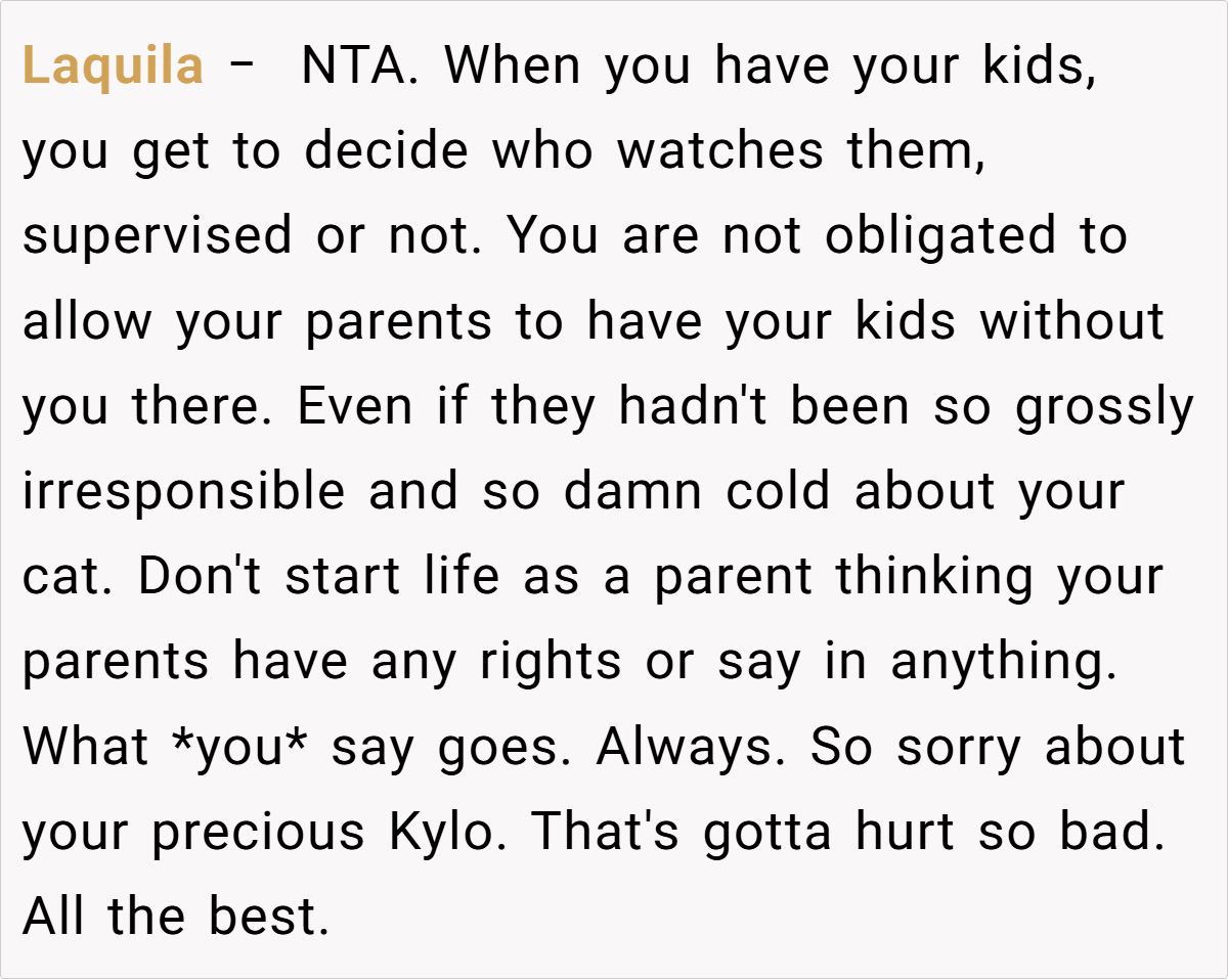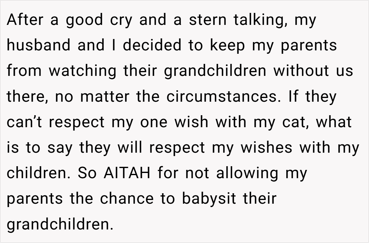 As she mourned the untimely loss of Kylo, she was forced to confront a painful truth: if her parents couldn’t honor a simple request for the safety of her pet, how could they be trusted with her most precious responsibility—her future children? In an effort to protect her family’s well-being, she decided to bar her parents from babysitting her grandchildren, sparking a heated debate about whether she was in the wrong for such a drastic decision.