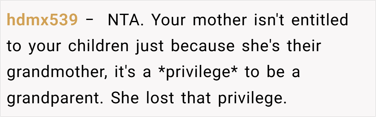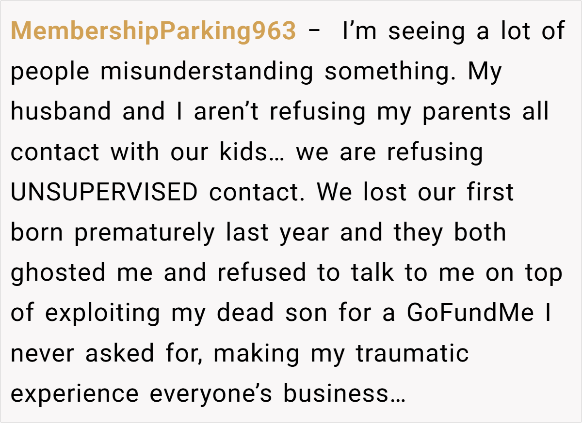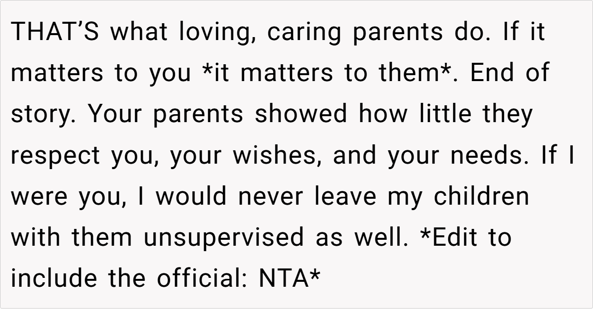 The Reddit community has been divided on this issue. Many sympathize with the poster’s loss and agree that her parents’ failure to respect clear instructions warrants serious consequences. They see her decision to withhold babysitting privileges as a necessary step to protect her future children.