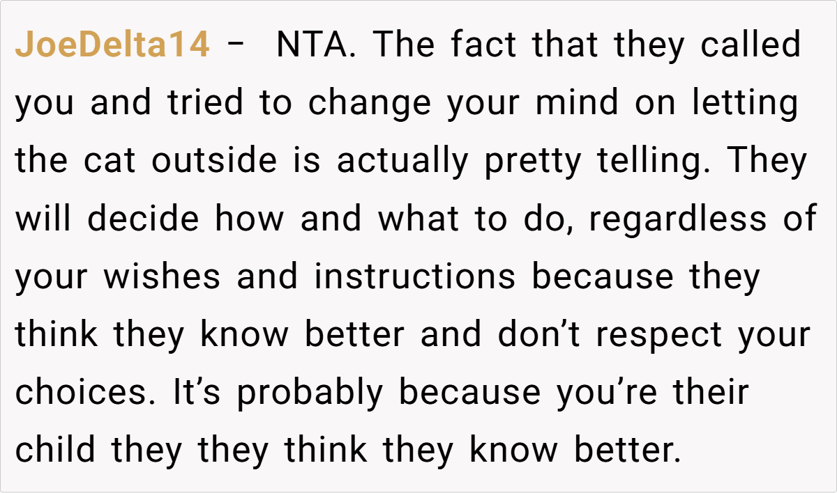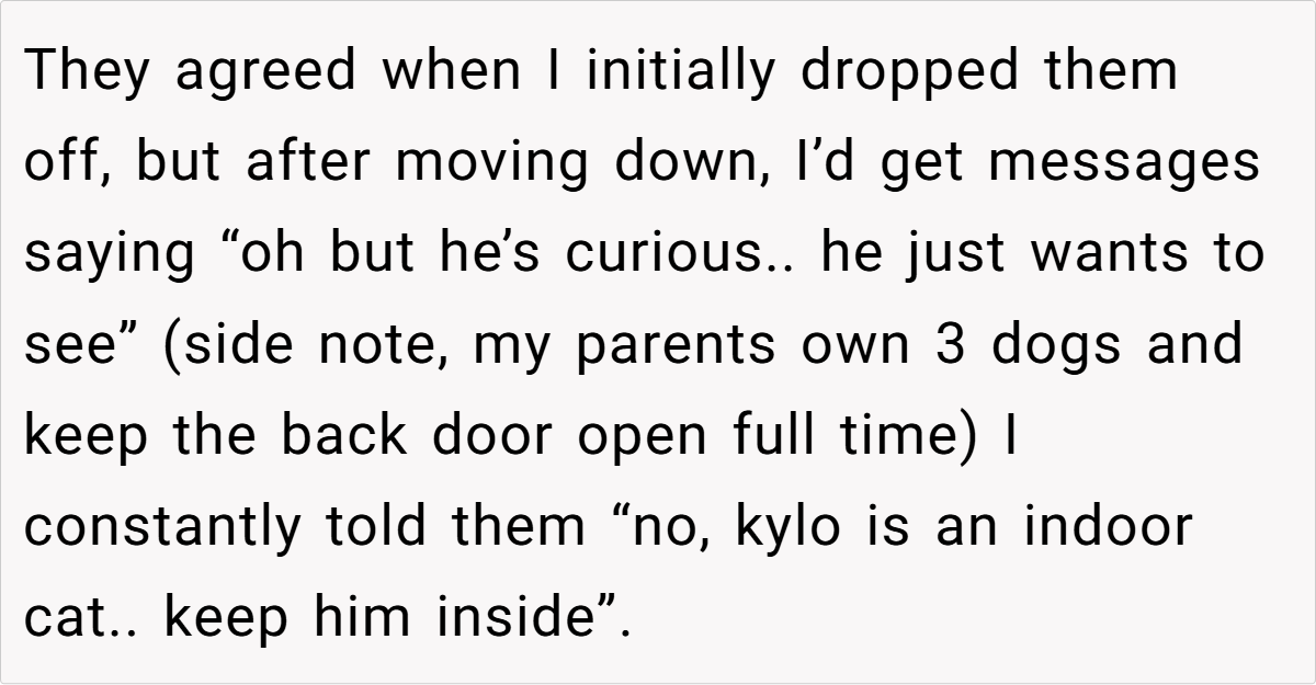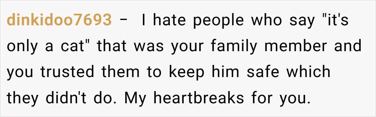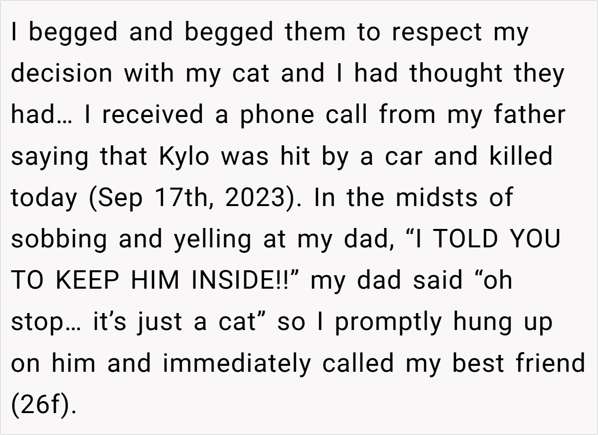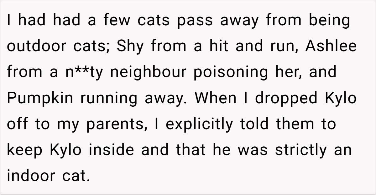 Family can be our greatest support—or our biggest challenge—especially when it comes to setting boundaries. In this story, a 26-year-old woman details the heartbreaking loss of her beloved indoor cat, Kylo, at the hands of her own parents. Despite explicit instructions to keep Kylo indoors, her parents’ casual attitude and disregard for her wishes led to a tragic accident. This loss was more than just the death of a pet; it symbolized a profound breach of trust and respect within her family.