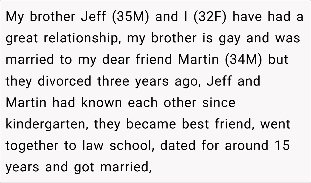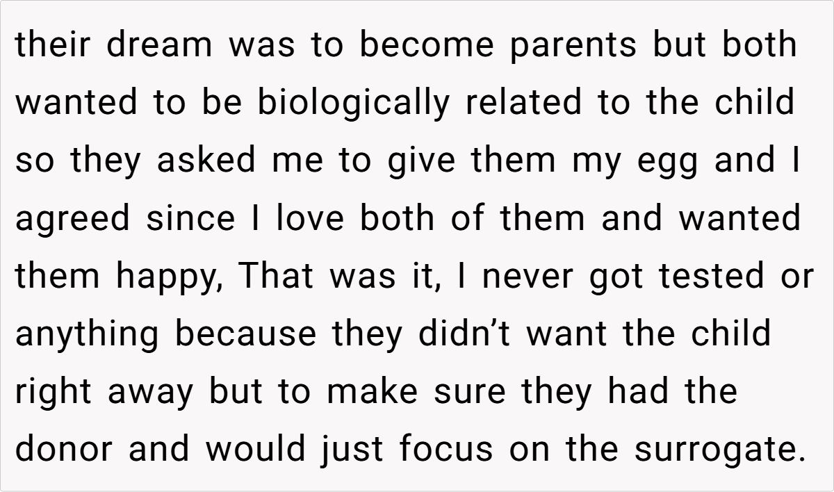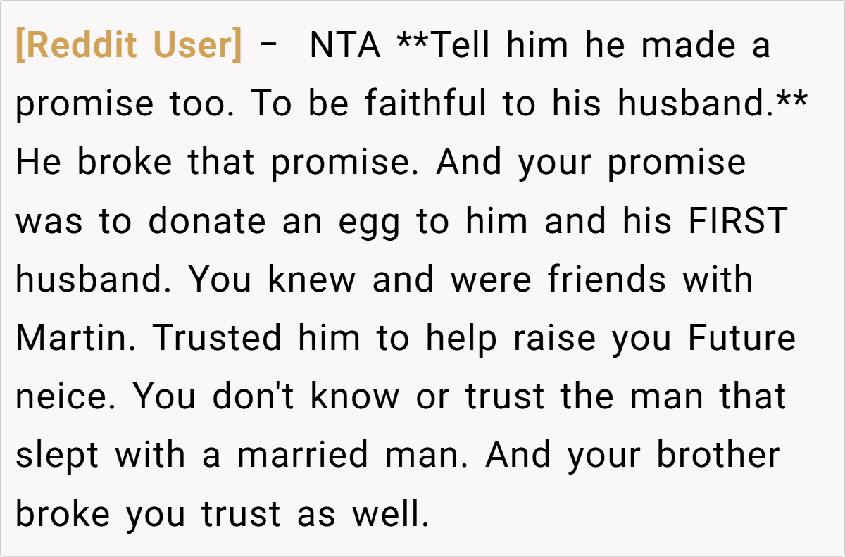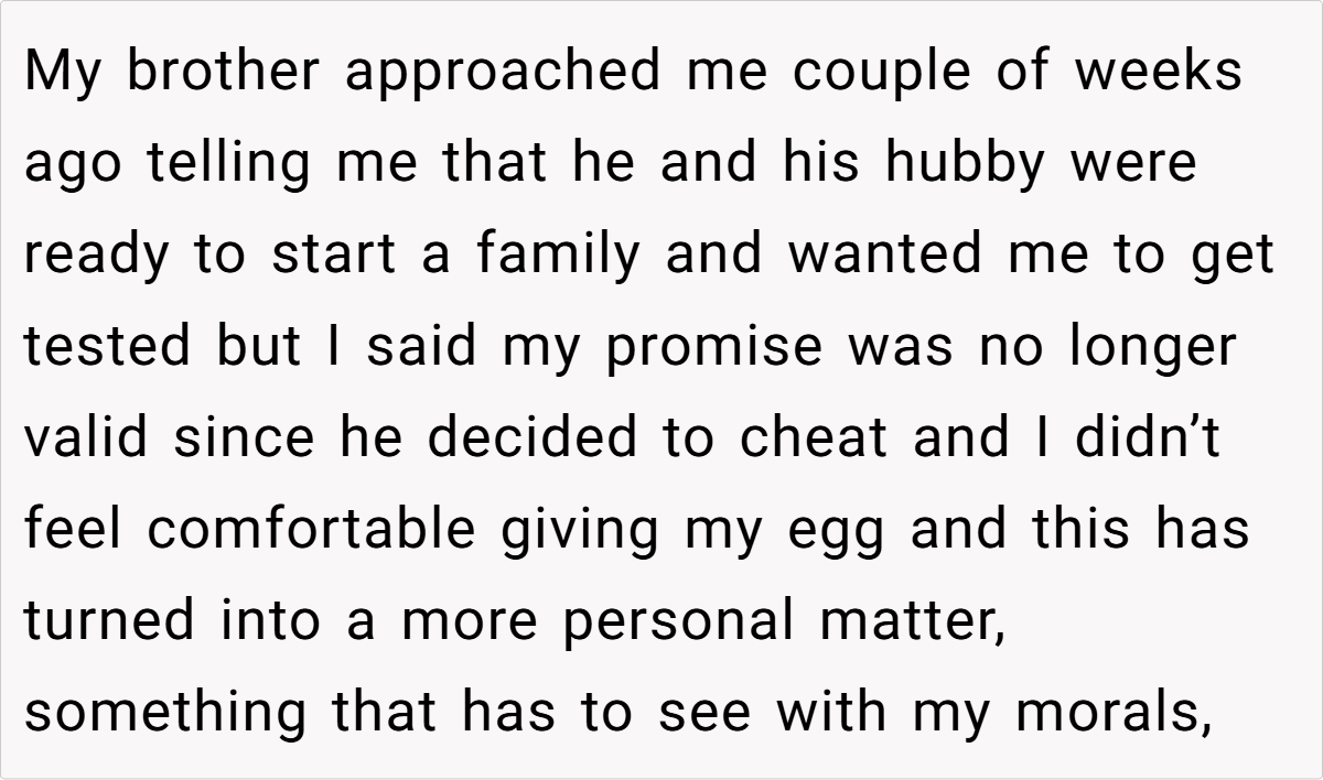 A Redditor shares her dilemma regarding her promise to donate her eggs to her brother and his ex-husband, a couple she once adored. After agreeing to be a donor years ago, her brother’s infidelity and quick marriage to the contractor who worked on their shared project shattered her trust.