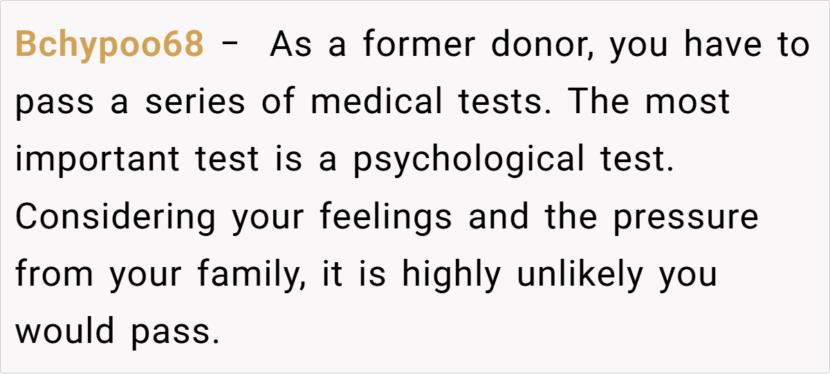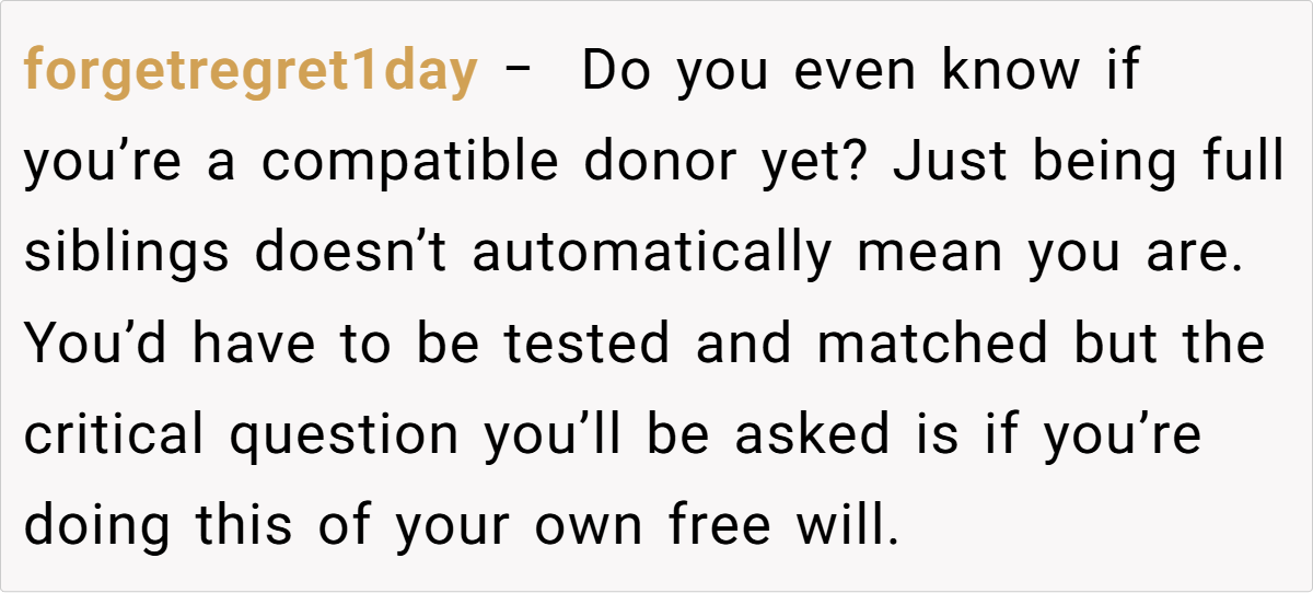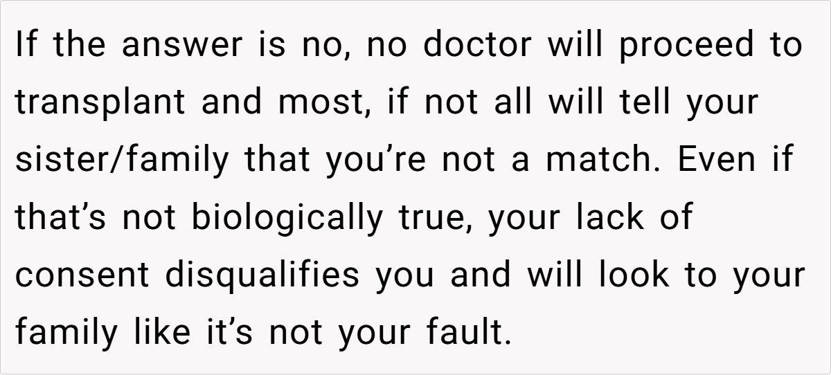 Ethicists also weigh in on situations like this, arguing that family obligation should never override personal autonomy. When the pressure from loved ones becomes overwhelming, it can skew the decision-making process, potentially leading to long-term regret. In scenarios where the donor feels resentful or conflicted, even a successful transplant may leave behind an emotional void. The ethical standpoint is clear: your body is your own, and any donation must be made freely without the heavy burden of coercion.